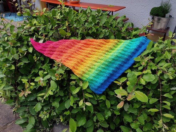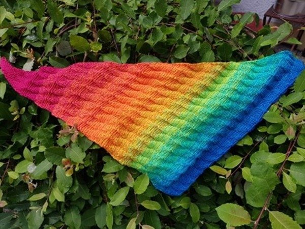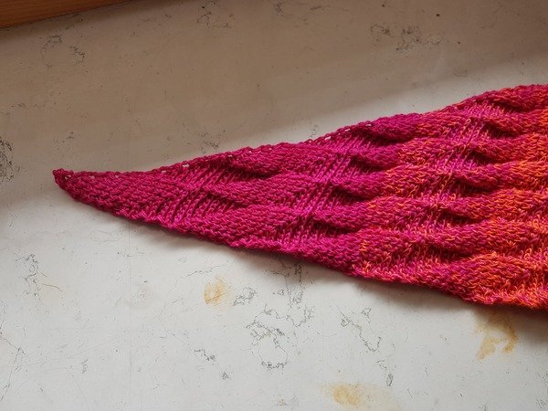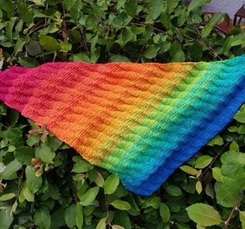 Das Dreieckstuch Anuket lebt von seinen Reliefstäbchen. Das plastische Muster besteht ausschließlich aus dieser Technik. Dadurch wird das Tuch sehr kompakt und wärmt (je nach Material) sehr.