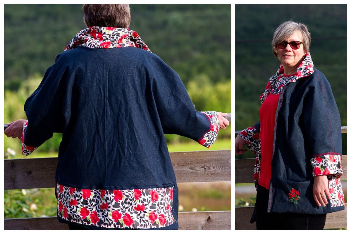 Die Jacke ist bis Größe XXXL tragbar und schmeichelt sowohl kurvigen als auch schlanken Figuren, die den Oversize-Stil schätzen. Charakteristisch sind die breiten, doppellagigen Schößchen am Vorder- und Rückenteil sowie die doppellagigen Ärmelabschlüsse, die ohne zusätzliche Säume auskommen.