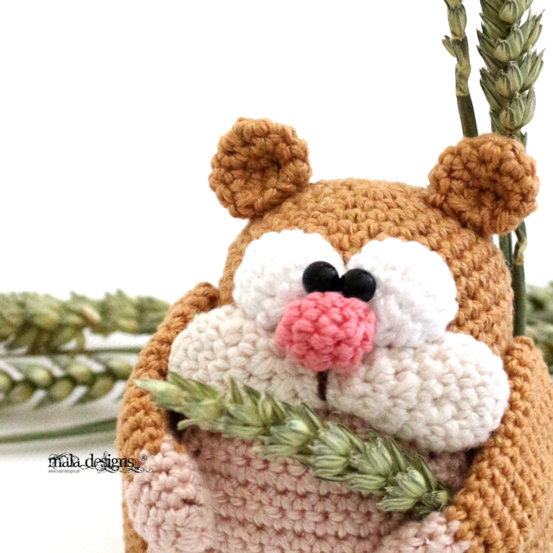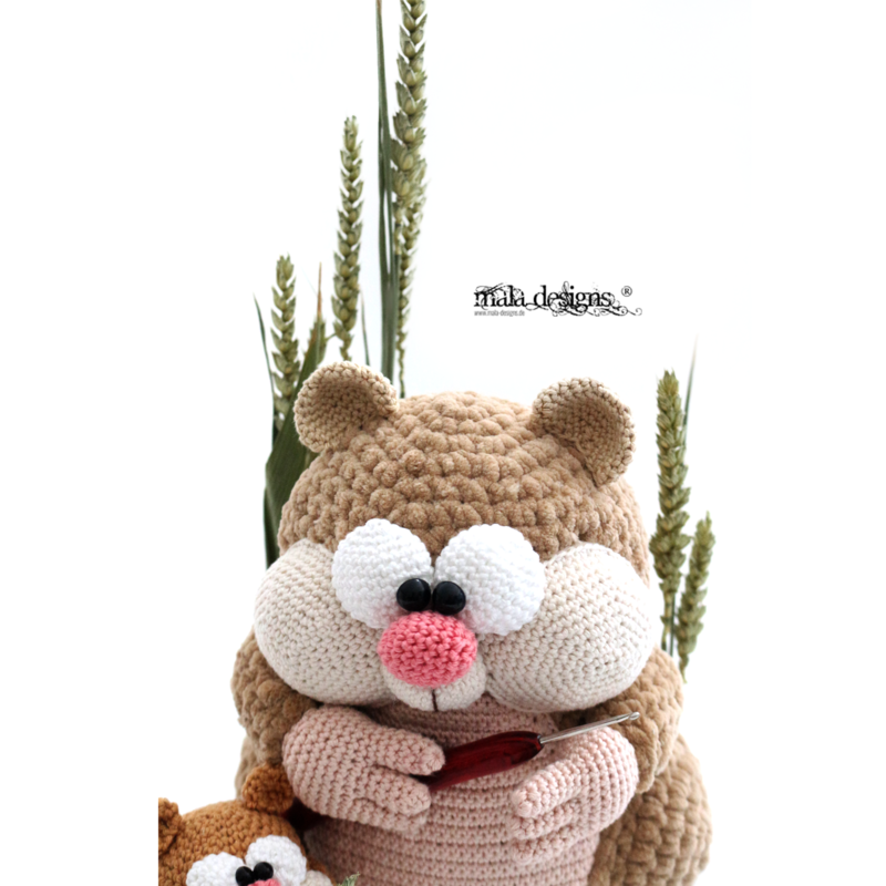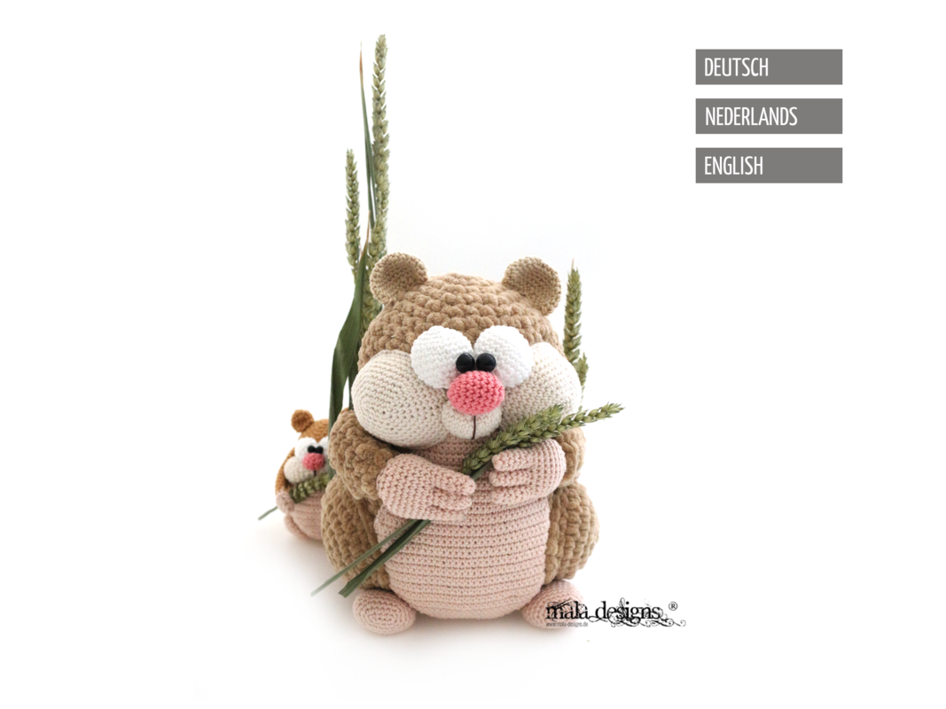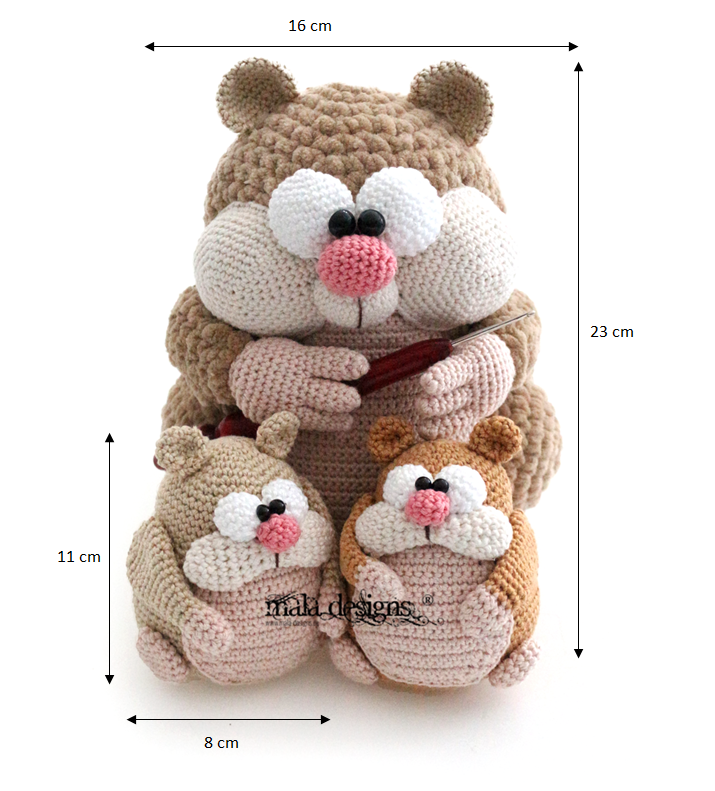 Diese Häkelanleitung beinhaltet die Beschreibung für den großen und die beiden kleinen Hamster. Nach Fertigstellung wird der große Hamster ca. 23 cm x 16 cm (HxB) und die kleinen Hamster ca. 11 cm x 8 cm (HxB) groß.