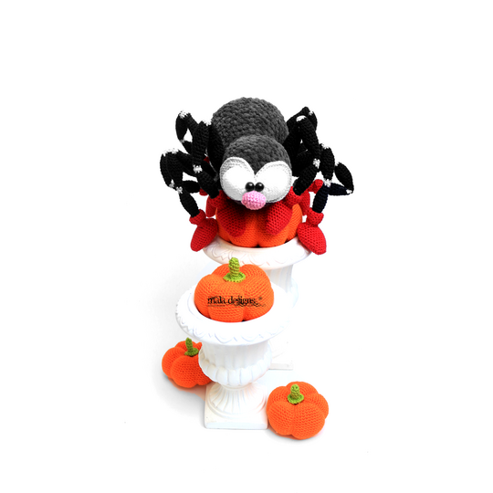 Diese Häkelanleitung beinhaltet die Beschreibung für drei unterschiedlich große Kürbisse und der Spinne. Nach Fertigstellung wird die Spinne ca.25 cm x 23cm x 15cm (LxBxH) groß.