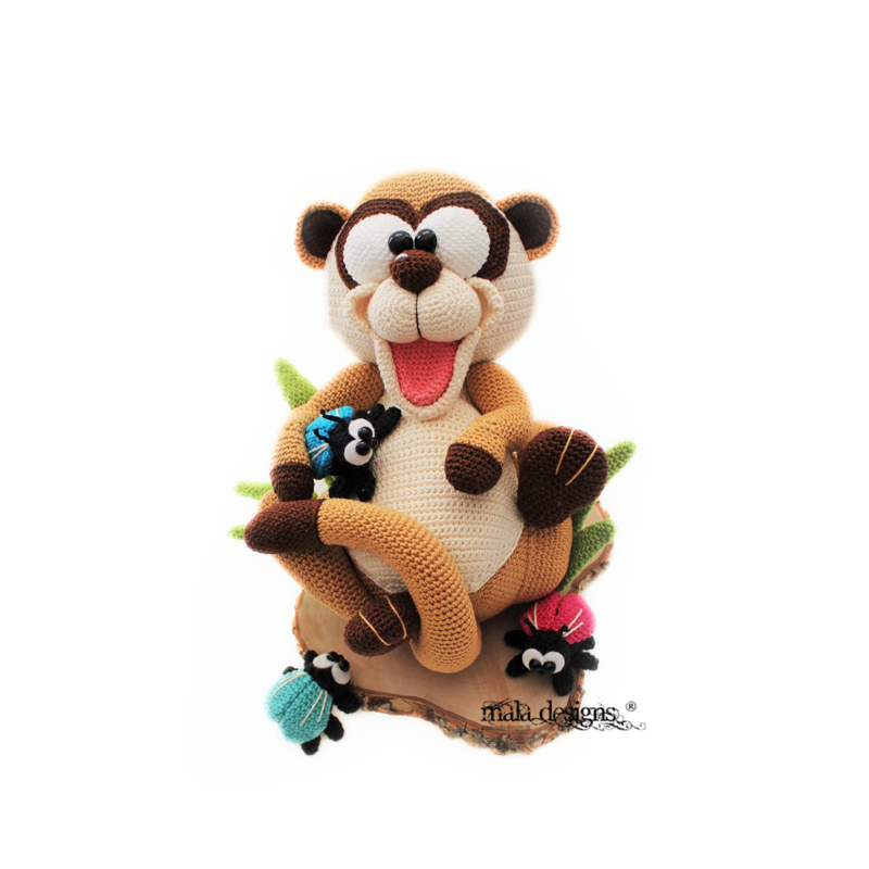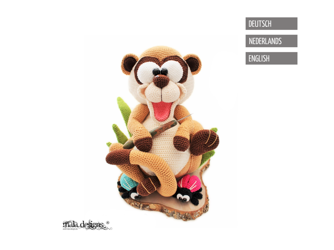 Diese Häkelanleitung beinhaltet die Beschreibung für das große Erdmännchen, Käfer und Grashalmen. Nach Fertigstellung wird das große Erdmännchen ca. 26cm x 24 cm (HxB; in Schräglage gemessen) groß. Die kleinen Käfer werden 6 cm x 3cm (LxH) groß.