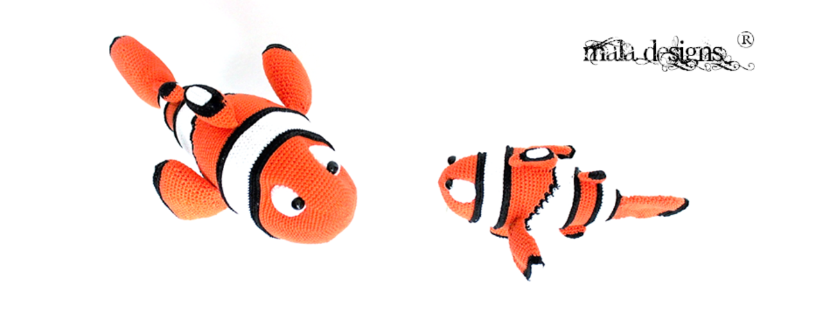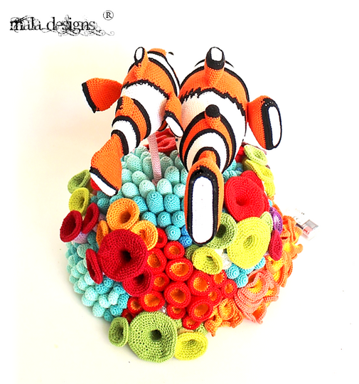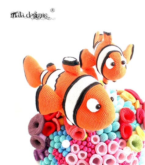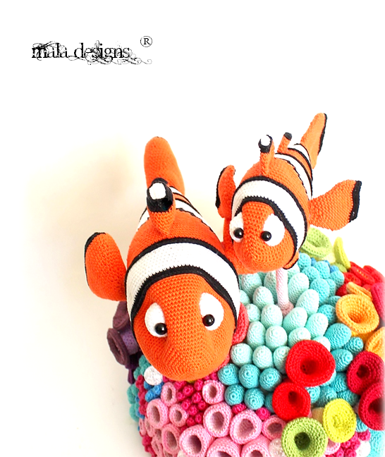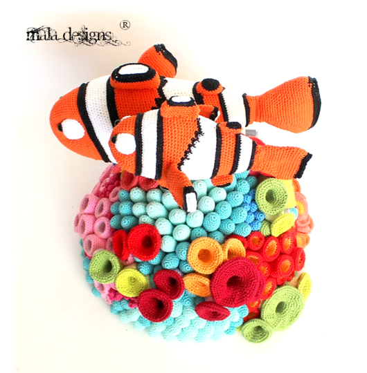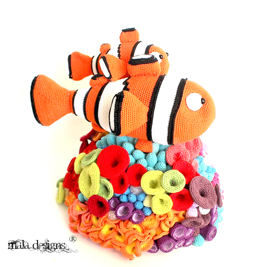 Das komplette Riff wird nach Fertigstellung ca. 40 cm x 60 cm (B x H) groß. Der große Clownfisch wird dabei ca.38 cm x 20 cm (LxH) groß und der kleine Clownfisch ca. 25cm x 15 cm (LxH) groß.Diese Häkelanleitung enthält die Beschreibung für beide Clownfische und dem Riff.