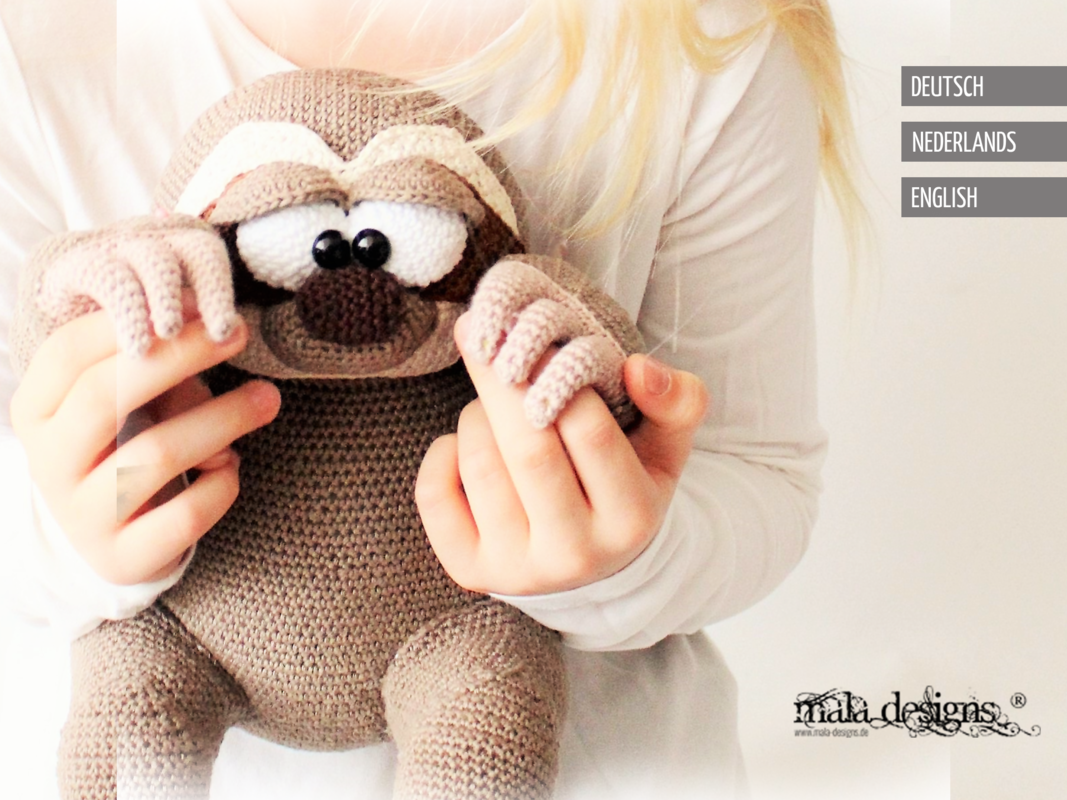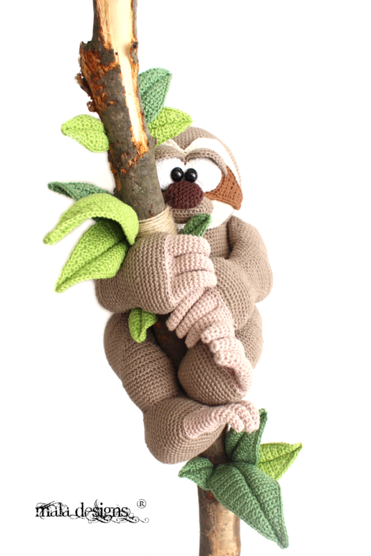Diese Häkelanleitung beinhaltet die Beschreibung für das abgebildete Faultier und den Blättern. Nach Fertigstellung wird das Faultier ca.22cm x 16cm (LxB; Sitzhaltung) groß.