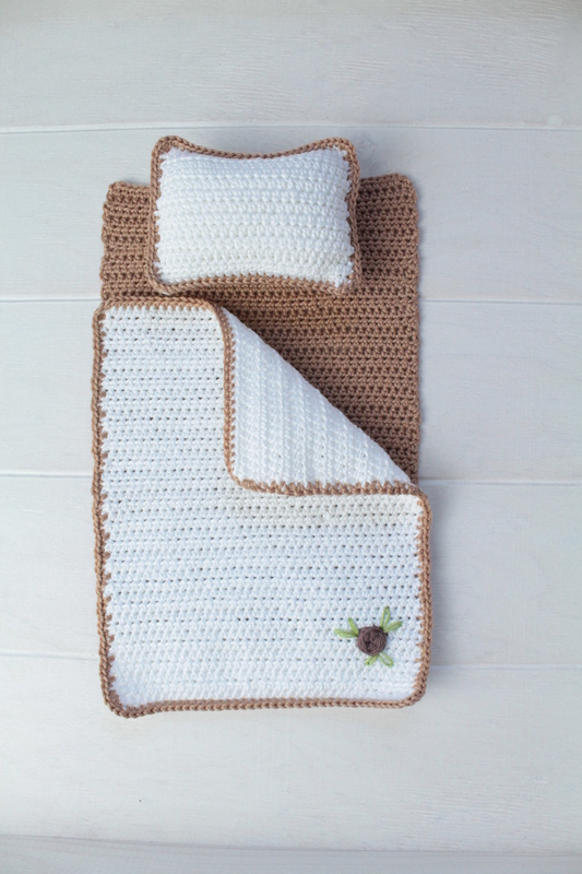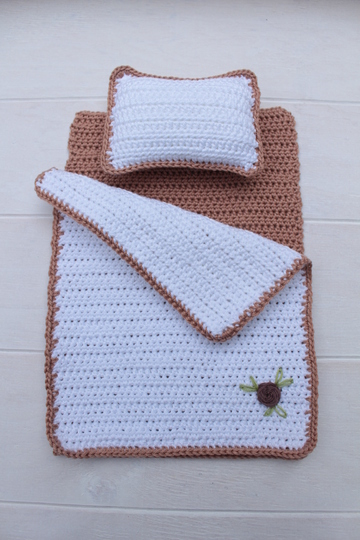 Häkle für sie mit Hilfe dieser Anleitung ein Bettlaken, ein Kissen und eine Decke.