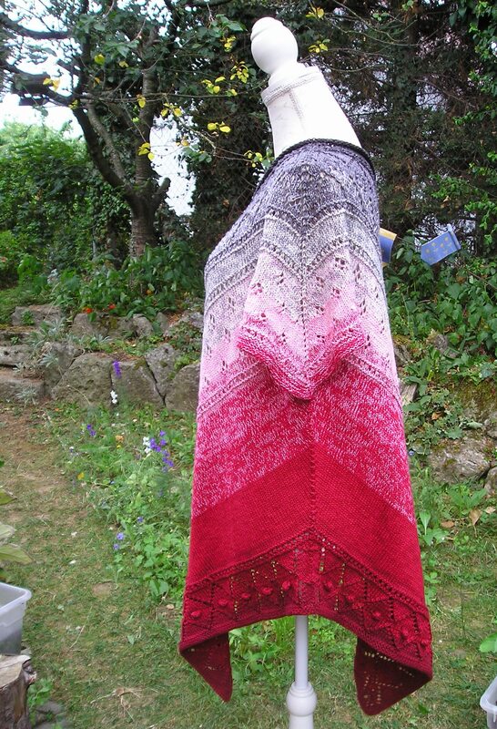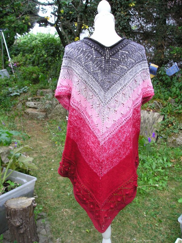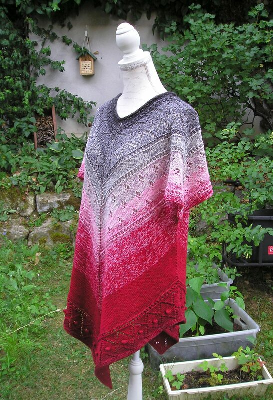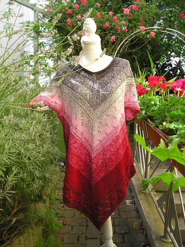 Die Tunika wird in einem Stück gestrickt beginnend vom Halsausschnitt bis zur unteren Kante. Dabei werden im oberen Teil bis zu den Ärmeln verschiedene Lochmuster eingearbeitet. Nachdem die Ärmel abgekettet sind, werden die restlichen Maschen wieder zu Runde geschlossen und der untere Teil der Tunika gestrickt.Es wird ein LoLa-Bobbel Farbverlaufsgarn (300 g, 5-fädig) von der Firma Garnmanufaktur verstrickt. Dabei entsteht ein locker fallendes Kleidungsstück für sommerliche Temperaturen. Die Tunikaform streckt und schummelt so ein paar Kilos weg.
