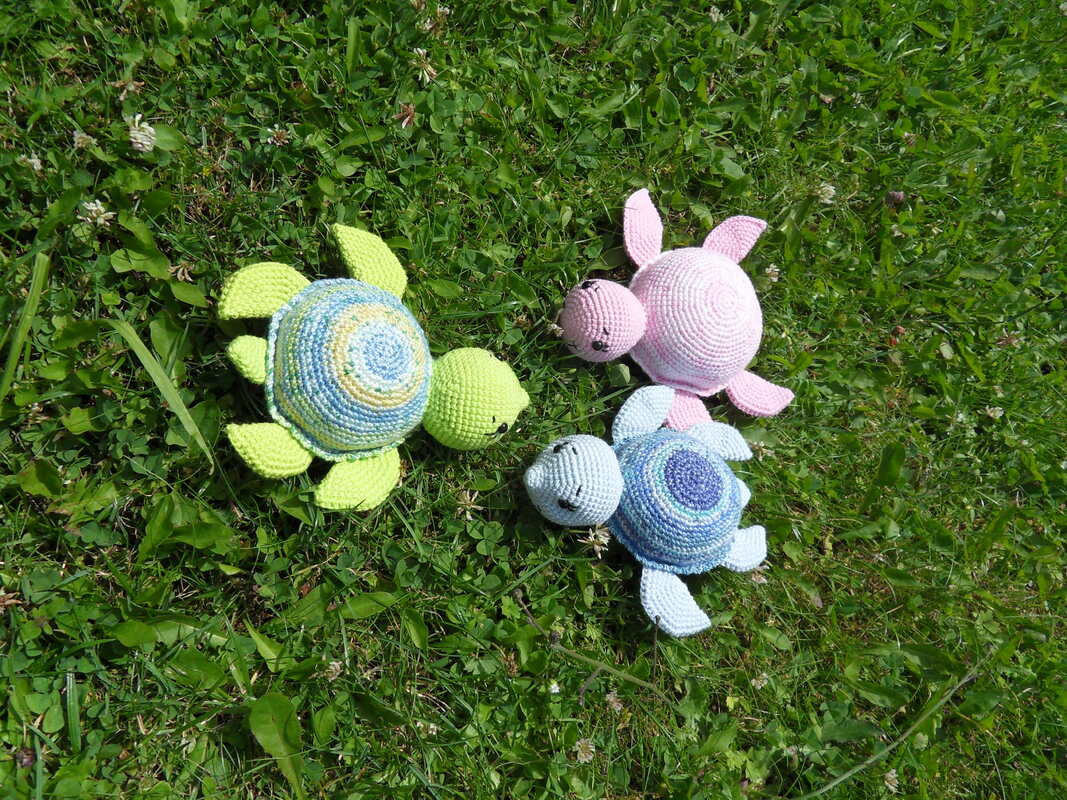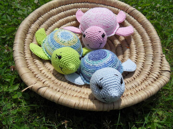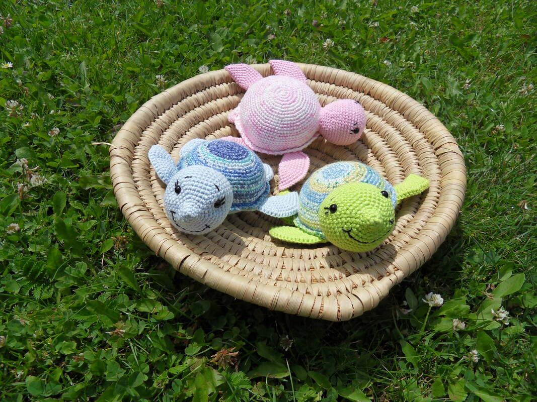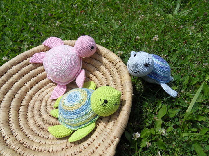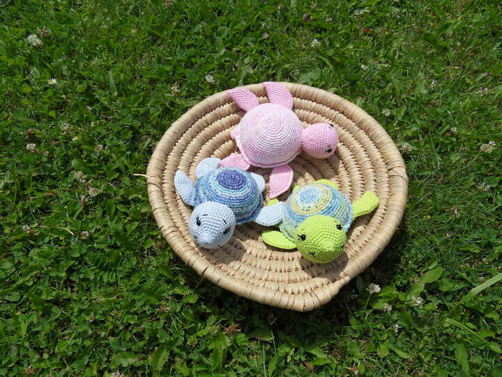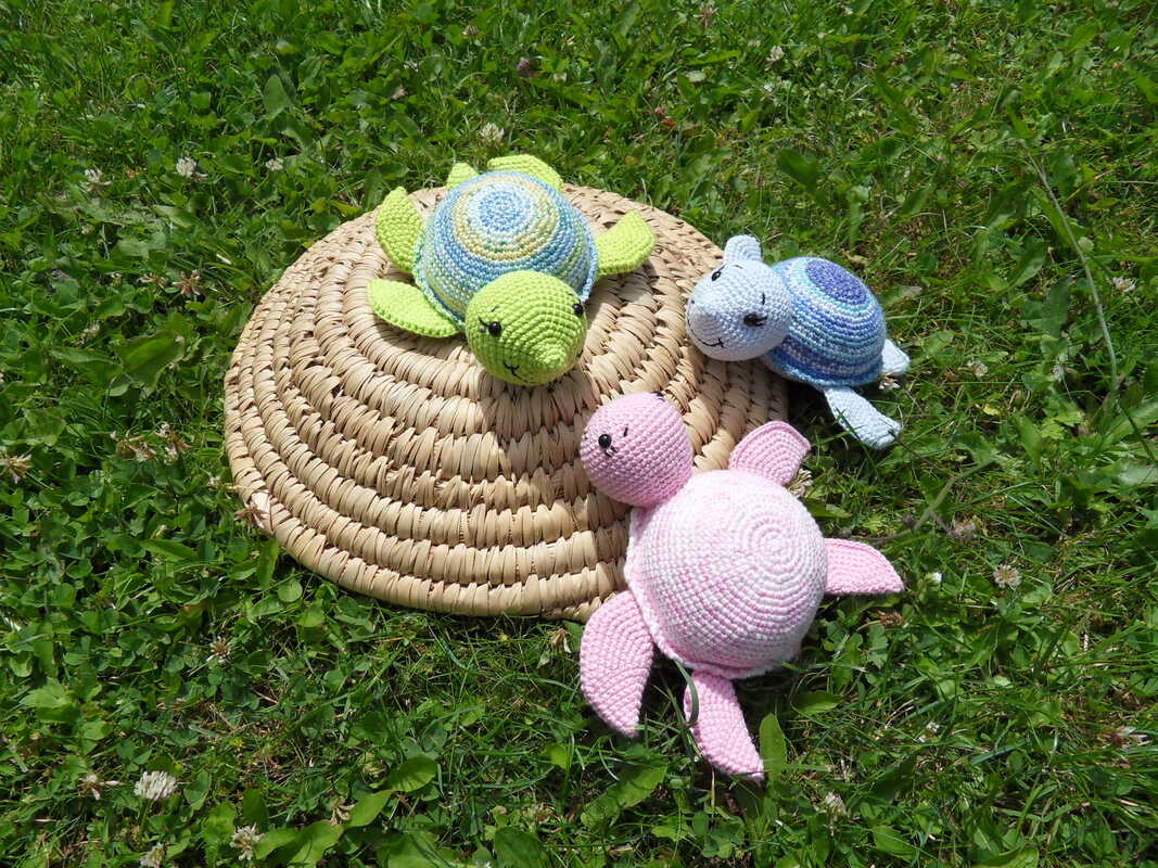 Hallo wir sind kleine Wasserschildkröten Rascheln und lieben es zu kuscheln und zu spielen. Die Raschel befindet sich in unseren Köpfchen. Wir wurden aus einem Baumwollgarn gehäkelt.