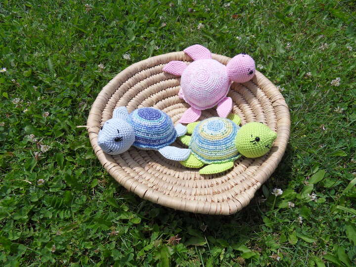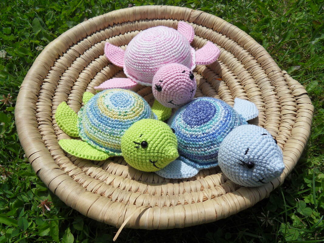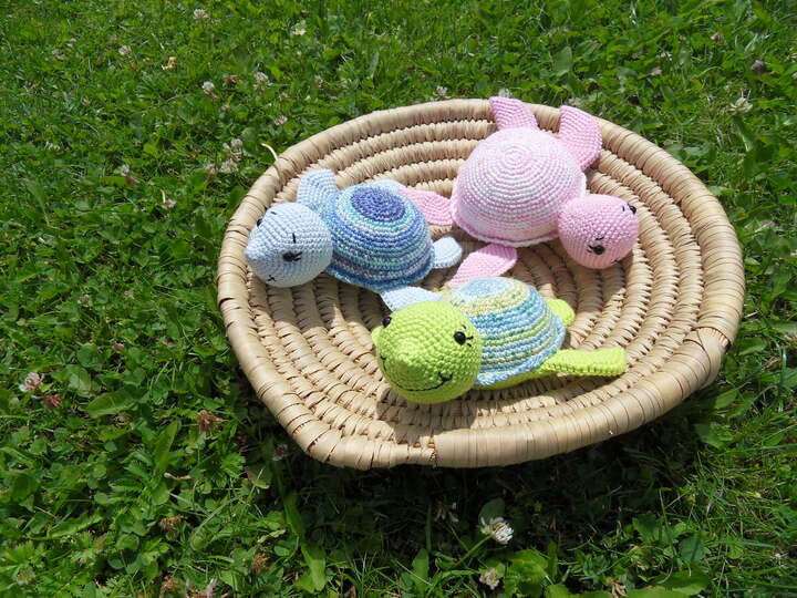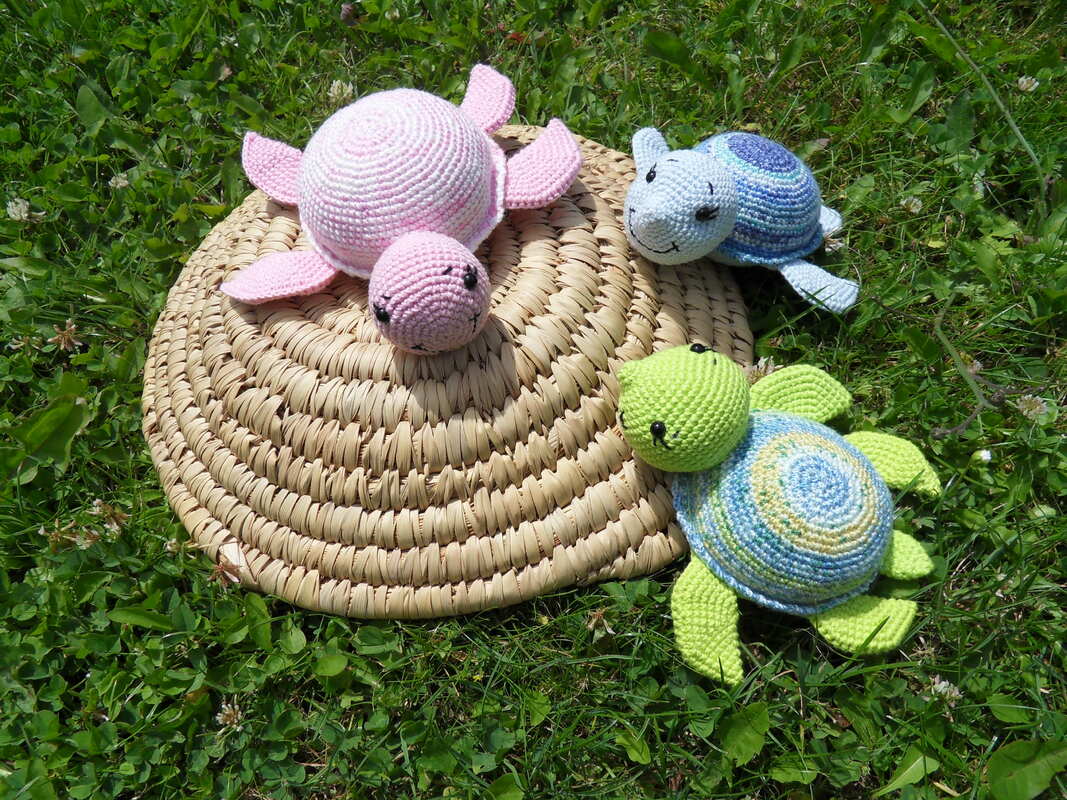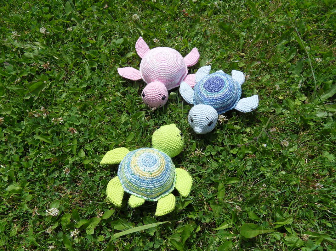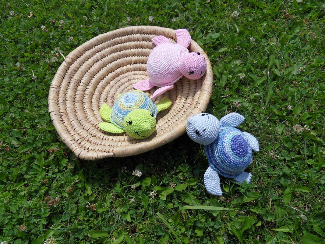 Hallo wir sind kleine Wasserschildkröten Rascheln und lieben es zu kuscheln und zu spielen. Die Raschel befindet sich in unseren Köpfchen. Wir wurden aus einem Baumwollgarn gehäkelt.
