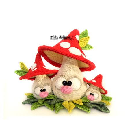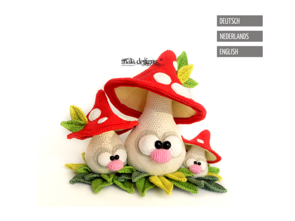 Anleitung beeinhaltet die Beschreibung für im Artikelbild dargestellten Pilze. Die Pilzfamilie wird nach Fertigstellung 23cm (großer Pilz), 16cm (mittlerer Pilz) und 9cm (kleiner Pilz) groß.
