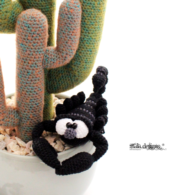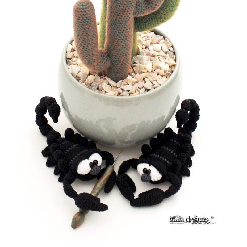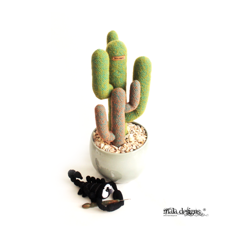 Diese Häkelanleitung beinhaltet die Beschreibung für die abgebildeten kleinen Skorpione und den Kakteen. Nach Fertigstellung wird der kleine Skorpion ca. 8 cm x 17 cm (HxL) groß; die Kakteen werden ca. 45 cm x 20cm groß. Weiterhin sind zusätzlich für die Anleitung ein Blumentopf und Dekosteine nötig.
