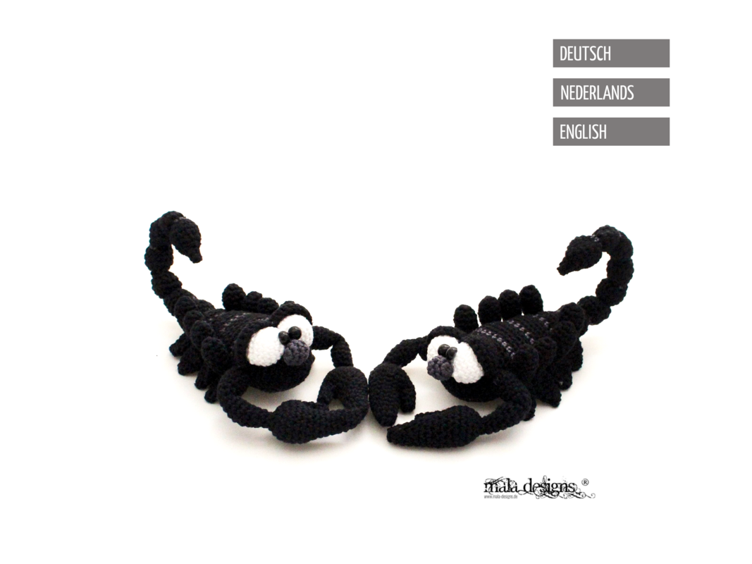 Diese Häkelanleitung beinhaltet die Beschreibung für den abgebildeten kleinen Skorpion. Nach Fertigstellung wird der kleine Skorpion ca. 8 cm x 17 cm (HxL) groß.