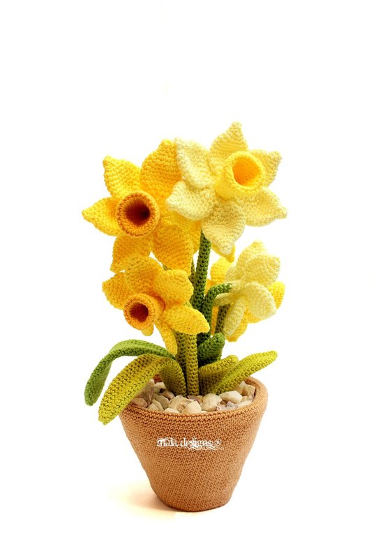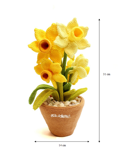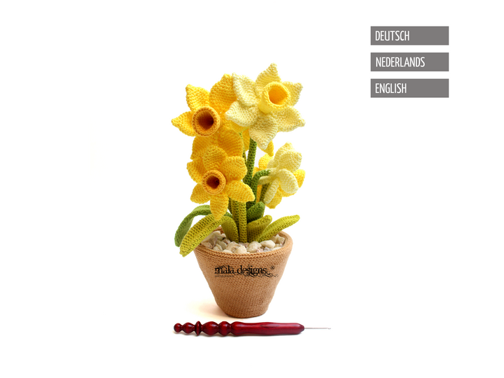 Diese Häkelanleitung beinhaltet die Beschreibung für den Blumentopf und Osterglocken. Nach Fertigstellung werden die Osterglocken im Blumentopf ca. 31 cm.