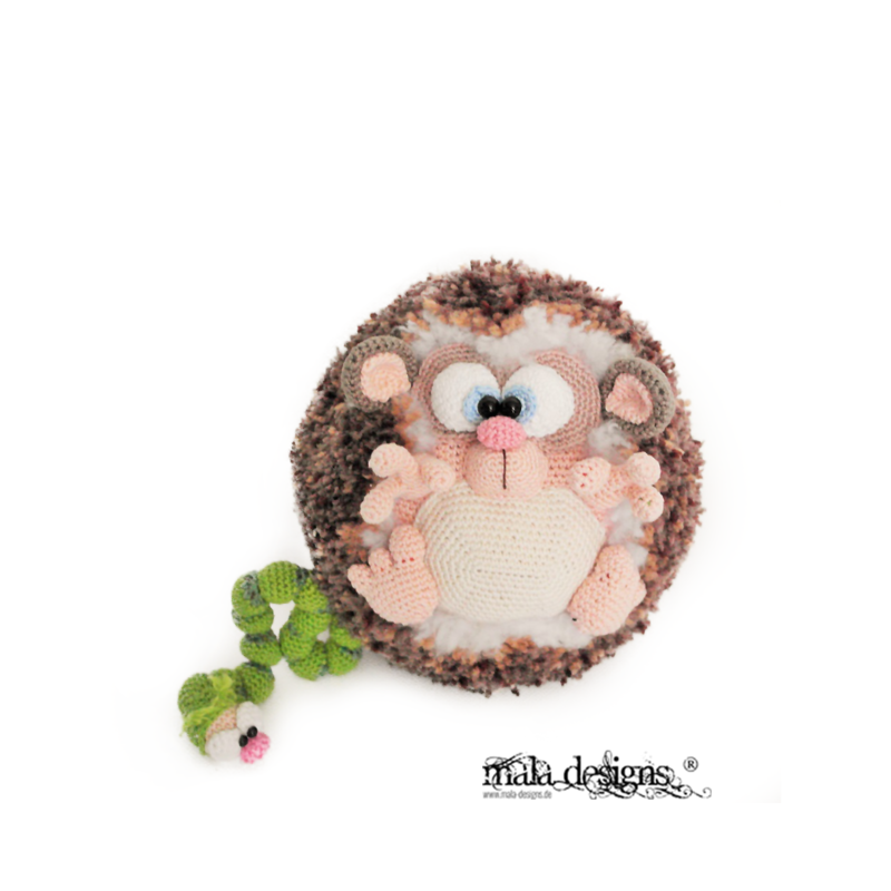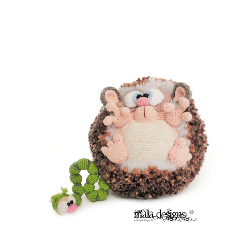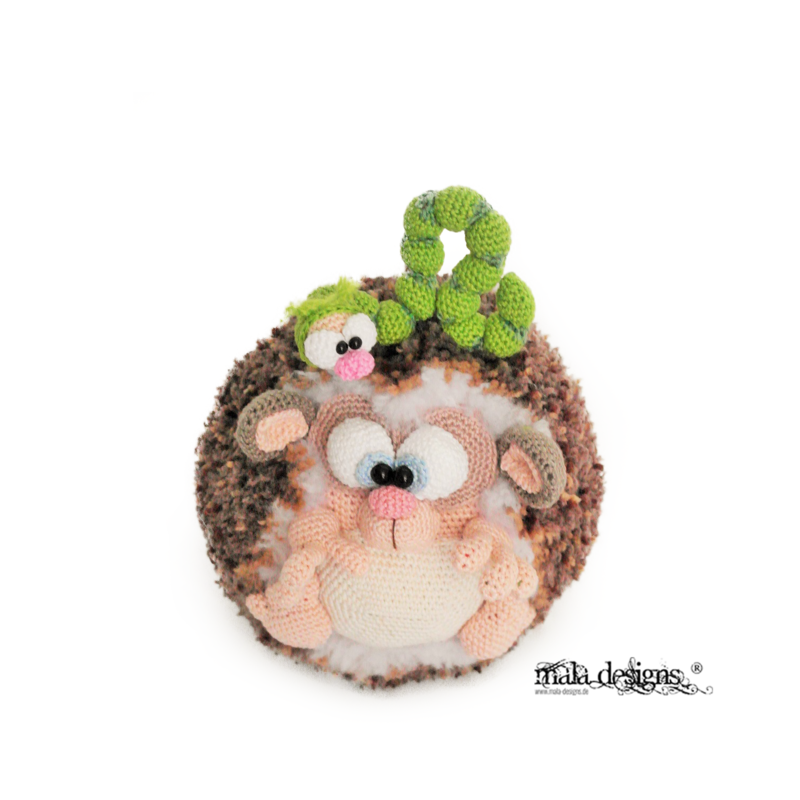 Diese Häkelanleitung beinhaltet: den großen Igel und die kleine Raupe Der große Igel wird nach Fertigstellung ca.21 cm x 21 cm (H x B) und die kleine Raupe (in gebogener Form) 10cm x 8cm groß.