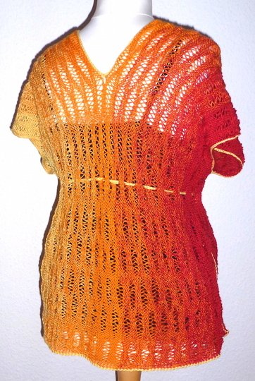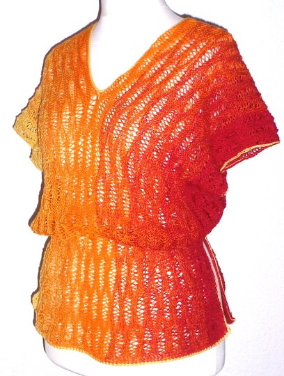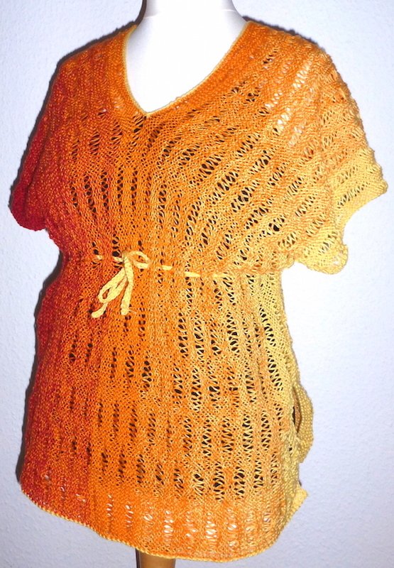 Durch das luftige Fallmaschenmuster lässt sich ein Bändchen ziehen – z.B. in Taillenhöhe oder unter der Brust. Somit kann der Pulli immer wieder anders getragen werden.
