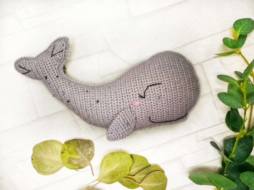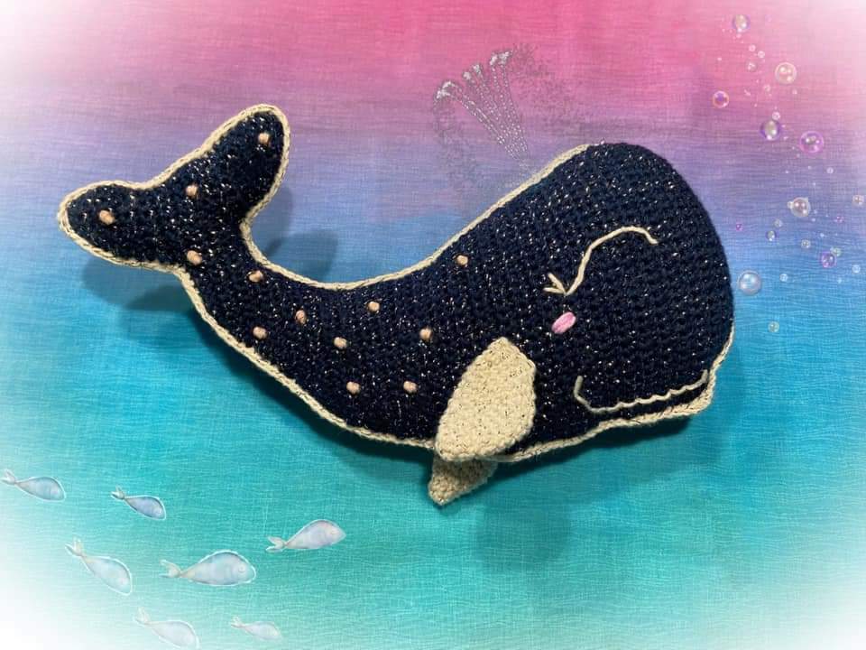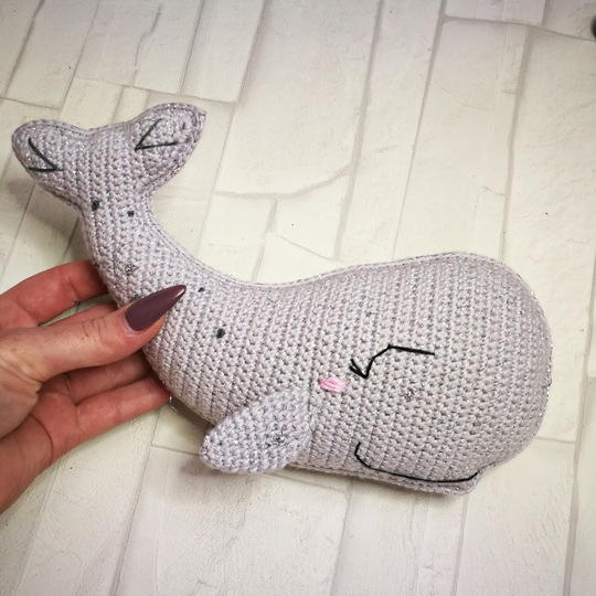 Mit angegebenem Garn (Catania glamour) wird der Wal ca. 23 cm lang.