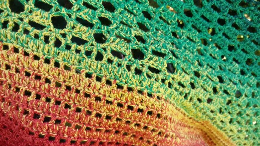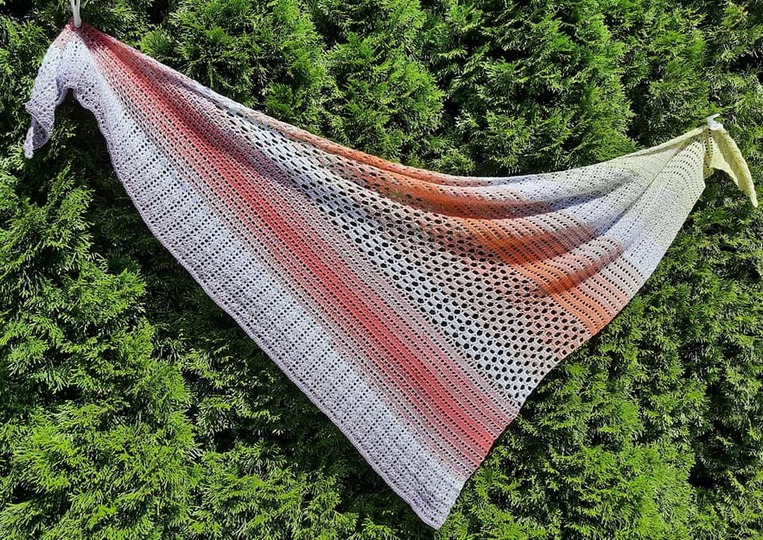 "Selene" ist ein asymmetrisches Tuch und wird von der Spitze zur breiten Seite gehäkelt. Es besteht aus sechs Musterteilen, die beliebig erweitert werden können. Die Muster sind geradlinig, aber dennoch wirkungsvoll und lassen eine schönen Farbverlaufsbobbel gut zur Geltung kommen.