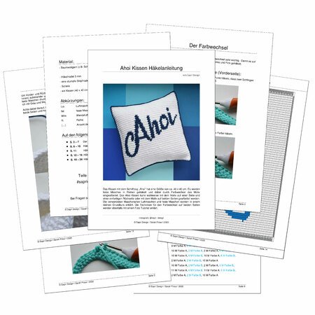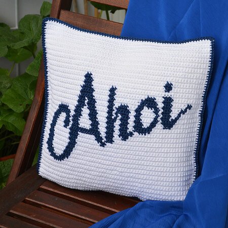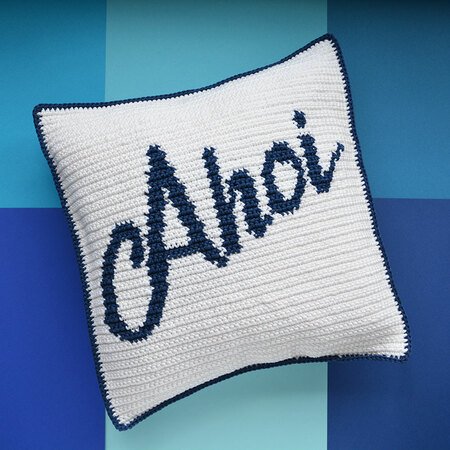 Das Kissen mit dem Schriftzug „Ahoi“ hat eine Größe von ca. 40 x 40 cm. Es werden feste Maschen in Reihen gehäkelt und dabei durch Farbwechsel das Motiv eingearbeitet. Das Ahoi Kissen kann wahlweise mit dem Motiv auf einer Seite und einer einfarbigen Rückseite oder mit dem Motiv auf beiden Seiten gearbeitet werden. Die verwendeten Maschenarten Luftmaschen und feste Maschen werden in einem kleinen Grundkurs erklärt. Die Techniken für den Farbwechsel auf beiden Seiten werden ebenfalls mit einem Foto Tutorial erklärt.