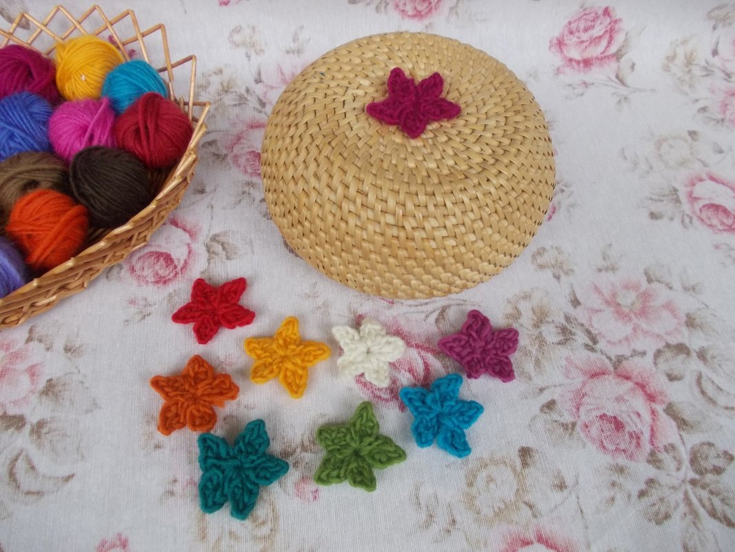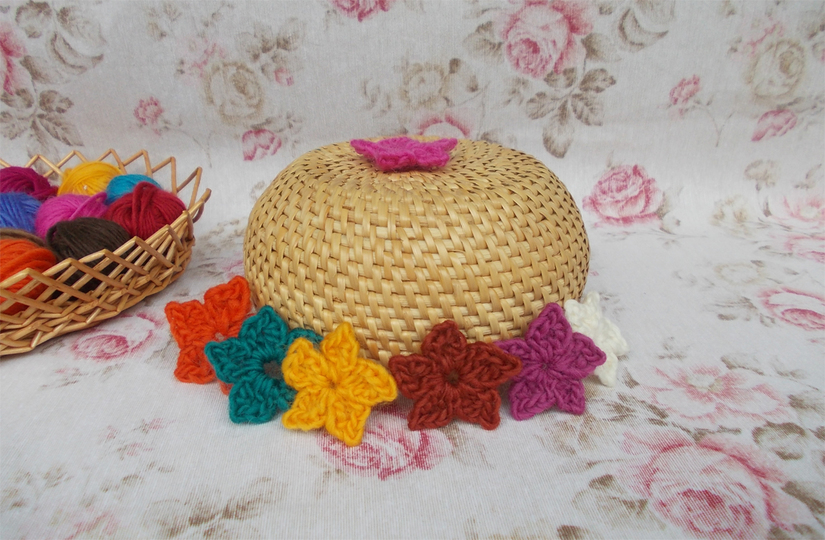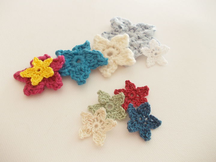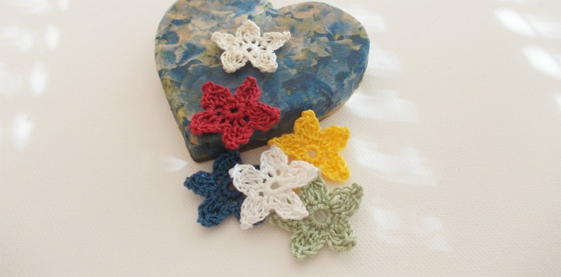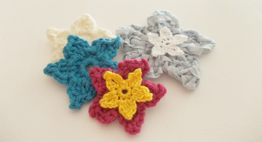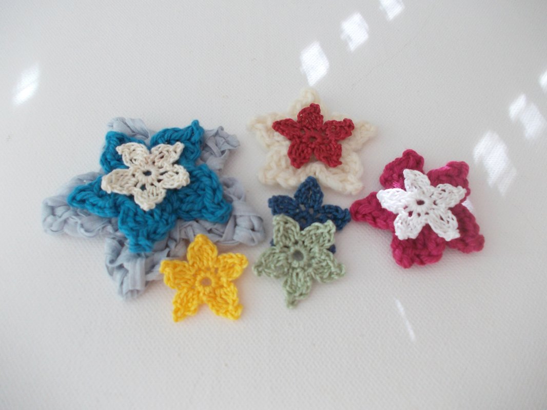 Es ist für Anfänger auch supereinfach. Ihr könnt dünnes Baumwollgarn, aber auch dickeres Garn verwenden. Reste eignen sich immer gut für kleine Häkelarbeiten, insbesondere für Blumen. Wie auf den Bildern zu sehen, können die Sterne auch als 3-D-Blume dekoriert werden. Ich habe hier filigranes Baumwollgarn, bunte dünne Wolle und breites Bändchengarn verwendet und jeweils das entsprechende Garn gehäkelt mit Nadel Nr. 1,5 Nr. 2, Nr. 3, 4 und 6.