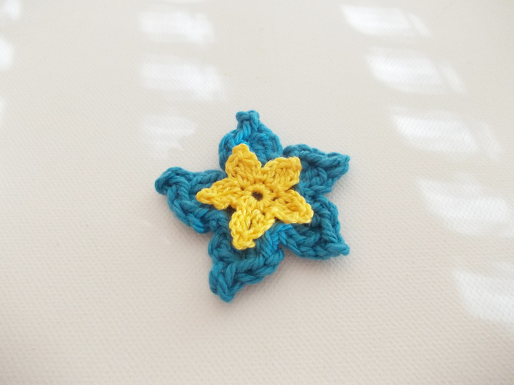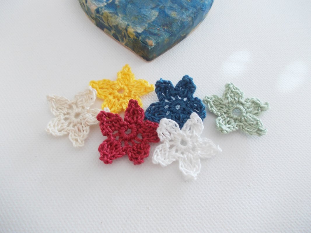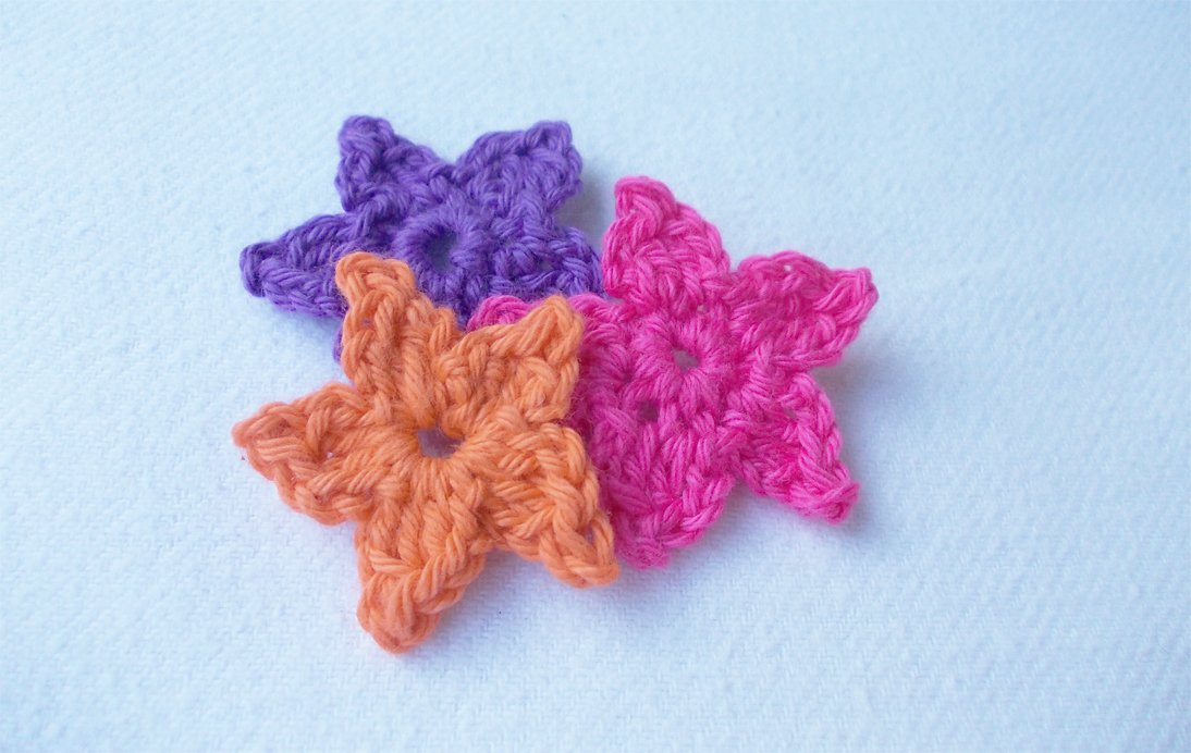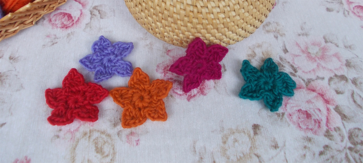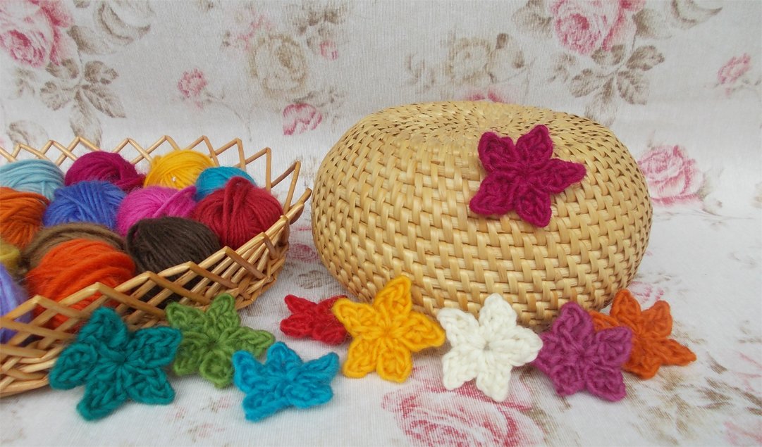 Es ist für Anfänger auch supereinfach. Ihr könnt dünnes Baumwollgarn, aber auch dickeres Garn verwenden. Reste eignen sich immer gut für kleine Häkelarbeiten, insbesondere für Blumen. Wie auf den Bildern zu sehen, können die Sterne auch als 3-D-Blume dekoriert werden. Ich habe hier filigranes Baumwollgarn, bunte dünne Wolle und breites Bändchengarn verwendet und jeweils das entsprechende Garn gehäkelt mit Nadel Nr. 1,5 Nr. 2, Nr. 3, 4 und 6.