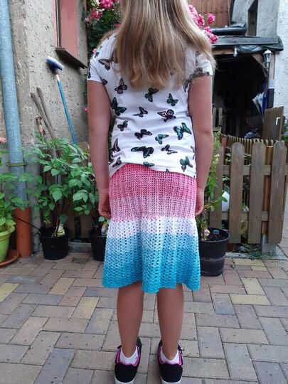Für die Größe 140 bis 156 benötigst du einen Bobbel von ca. 800m bis 1000m, je nachdem wie locker oder fest du häkelst bzw. wielang dein Rock werden soll