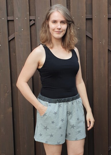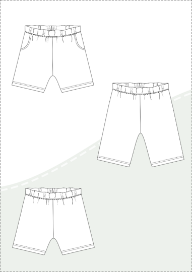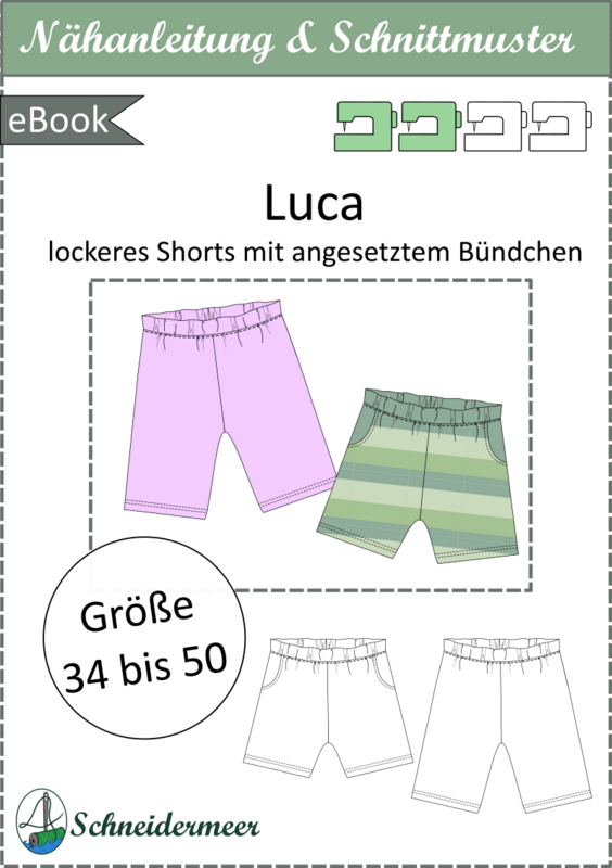 Das Schnittmuster „Luca“ ist eine lockere Shorts mit angenähtem Bündchen. Das Gummiband sorgt für eine gute Passform an der vertieften Taille und lässt sich individuell anpassen. Du musst daher keinen Reißverschluss einnähen.