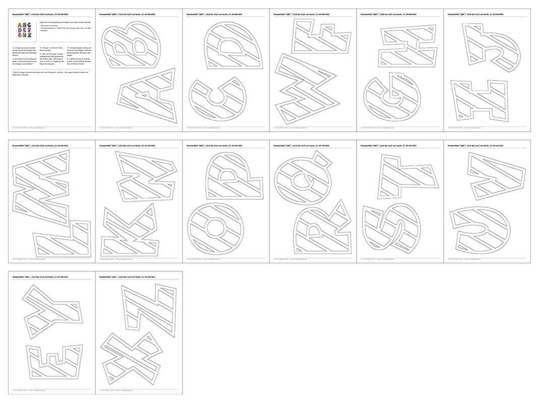 Es sind Vorlagen für alle Buchstaben des Alphabets vorhanden, sie können also entweder einzeln oder zu Worten verbunden auf den Fenstern verteilt werden.