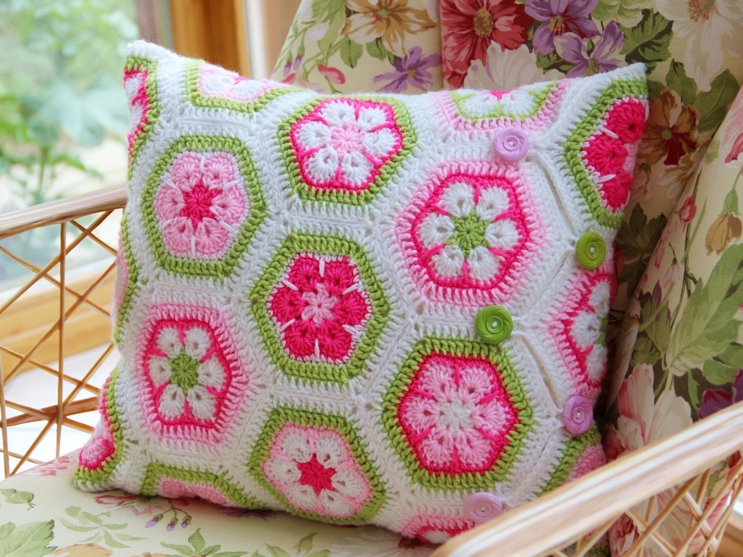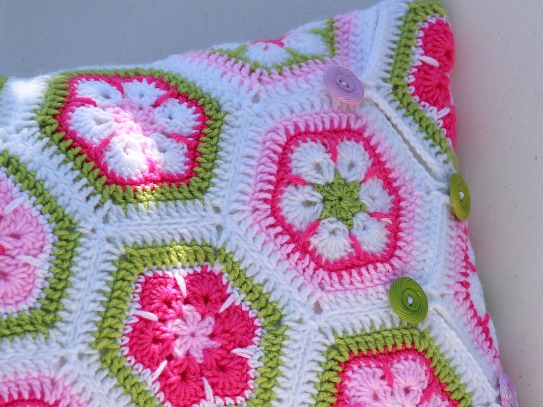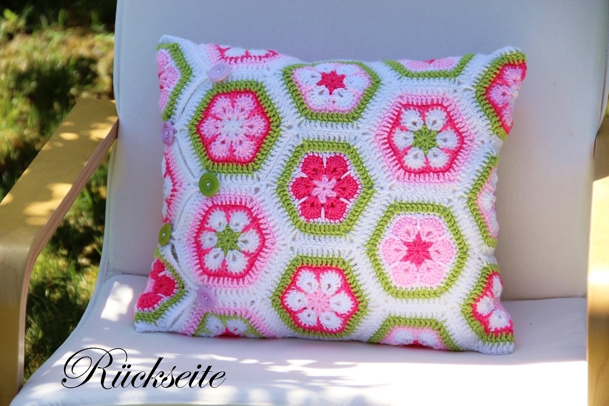 Könnt Ihr Euch dieses schöne bunte Kissen im Kinderzimmer Eurer Kinder oder Enkel vorstellen? So eines hätte ich in meiner Kindheit auch gern gehabt. Es wäre wohl mein Lieblingskissen geworden, so bunt und fröhlich wie es ist. Es macht einfach gute Laune - schon beim Häkeln, das verspreche ich Euch. Der Kissenbezug wird mit 5 Knöpfen geschlossen und ist in der Waschmaschine waschbar.