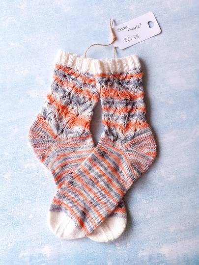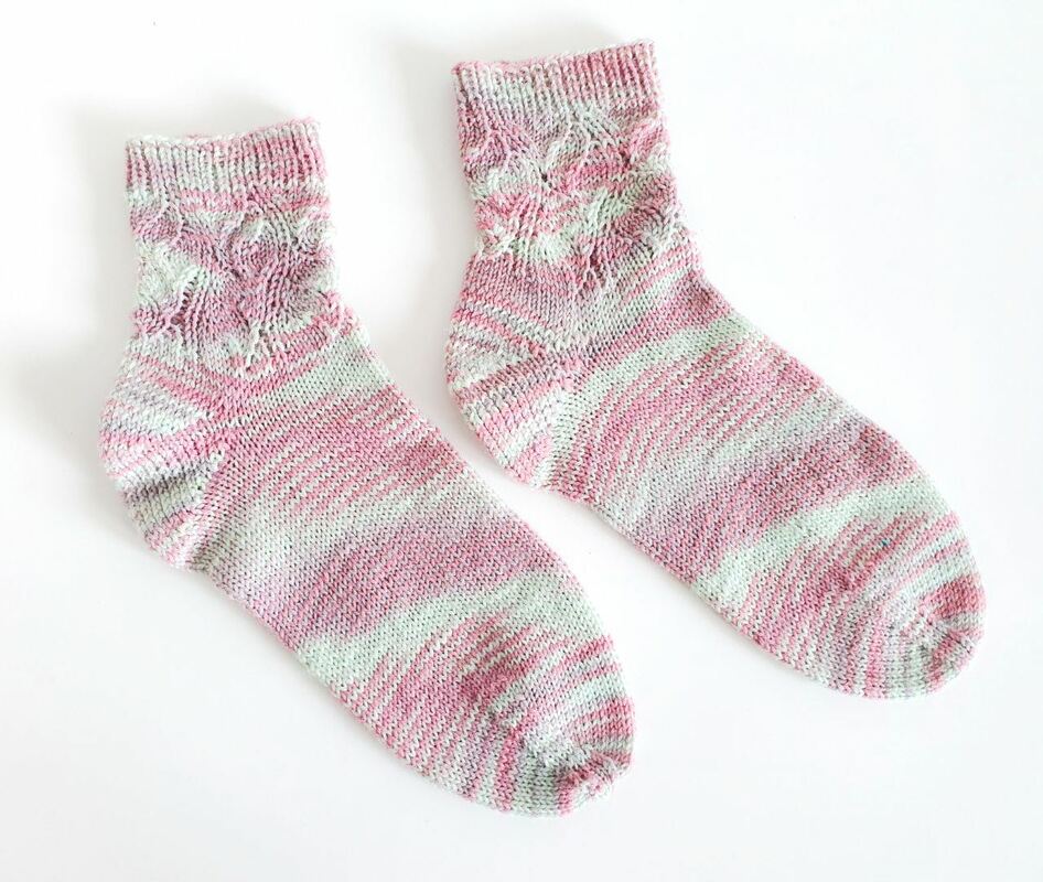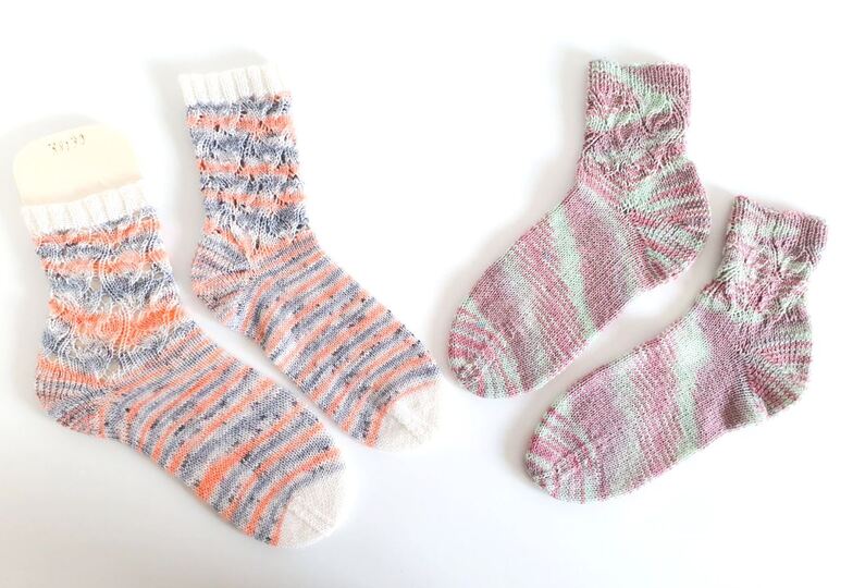 Die Socken werden im Lochmuster vom Bündchen abwärts über die
