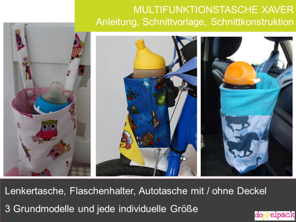 Mit Hilfe dieser Anleitung kannst Du eine Lenkertasche, ein Bettutensilo, einen Flaschenhalter, eine Autotasche mit oder ohne Deckel in verschiedenen Größen nähen. Außerdem ist in der Anleitung unter "Schnittkonstruktion" ausführlich und leicht beschrieben, wie Du eine beliebige Tasche nach Deinen indiviuduellen Maßen nähen kannst.