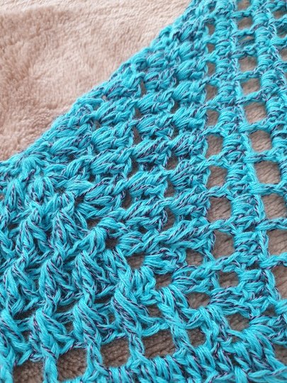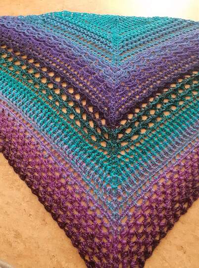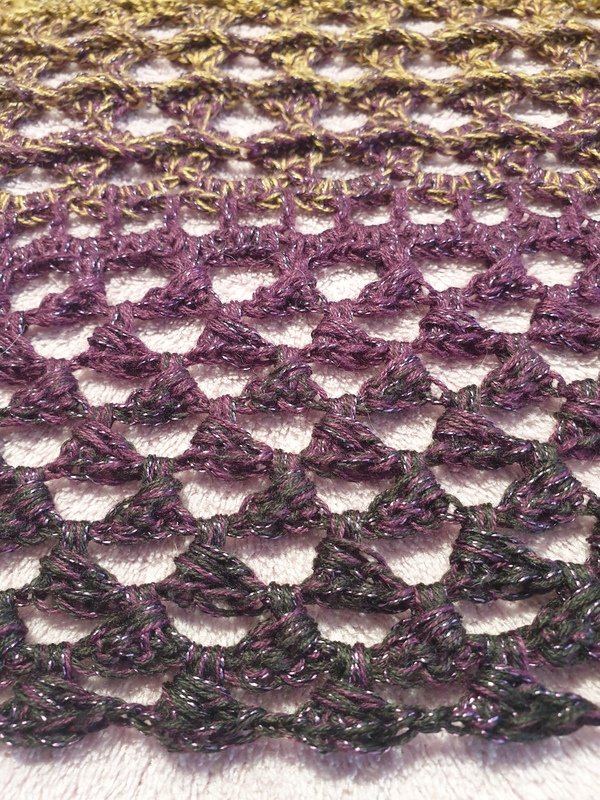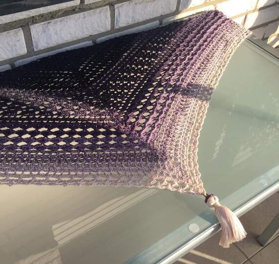 Ich habe für mein Tuch einen Bobbel (Farbverlaufsgarn) mit dem Namen Gertrud von Steffis Wollbobbel verarbeitet. Er hatte eine Lauflänge von 1000 Meter, war 3-fädig plus 1 Faden Viskosebeilaufgarn in Lila. Ich habe mit einer Häkelnadel in Stärke 4 gehäkelt und mein Tuch ist ungespannt an der oberen langen Kante 160 cm lang und 70 cm tief.