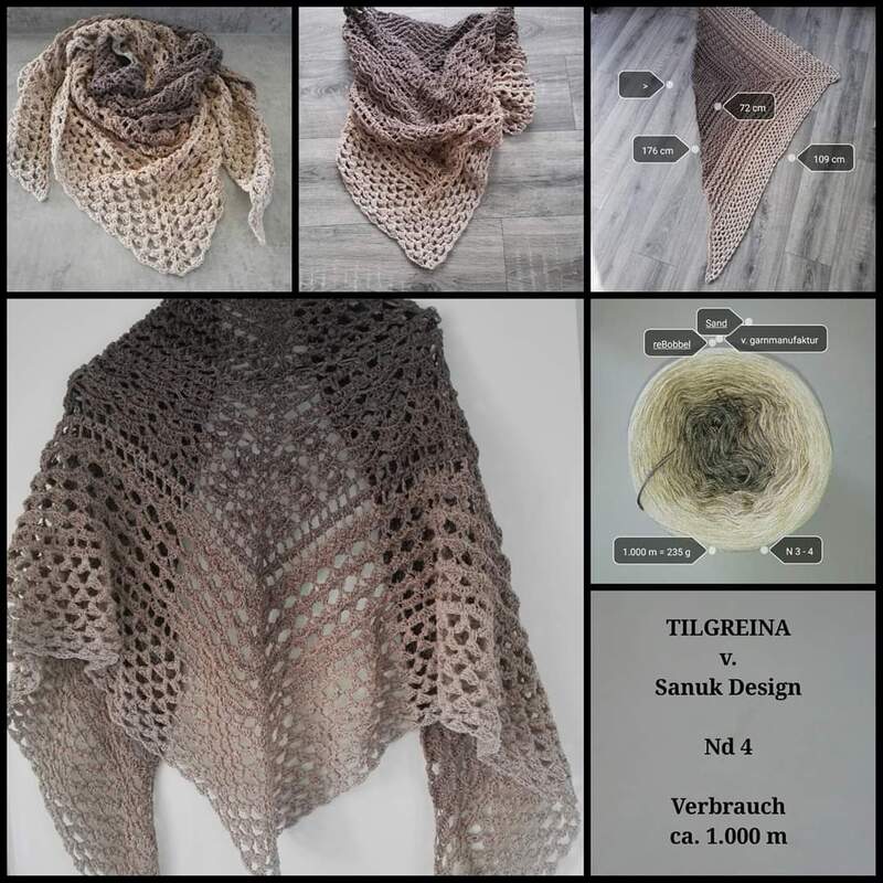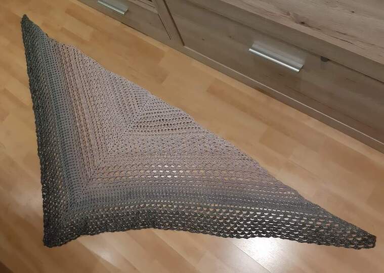 Wenn Du Dein Tuch größer machen möchtest, ist das kein Problem. Es sind dazu mehrere Möglichkeiten genannt, incl. Umrechenhilfe von Gramm zu Meter. So kannst Du ganz leicht feststellen, was mit Deiner noch zur Verfügung stehenden Restwolle machbar ist.