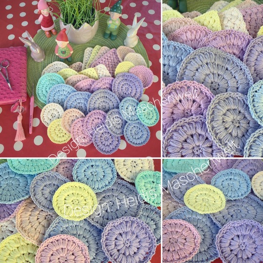 die kleinen Pads haben einen Durchmesser von ca. 6,5 cm, mit einer zusätzlichen Reihe der Büschelmaschen kannst du dir auch eine große Version mit einem Durchmesser von ca 8 cm anfertigen