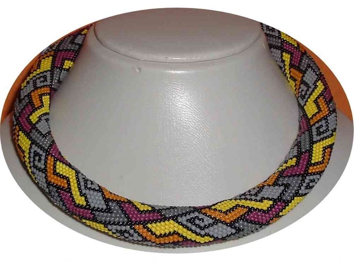Sie erhalten den Musterrapport zum Perlenhäkeln mit festen Maschen mit 26M/Perlen pro Runde für das Muster Nalora 2. Farben: schwarz (Umrandung), gelb, curry, weinrot, 2 Grautöne.