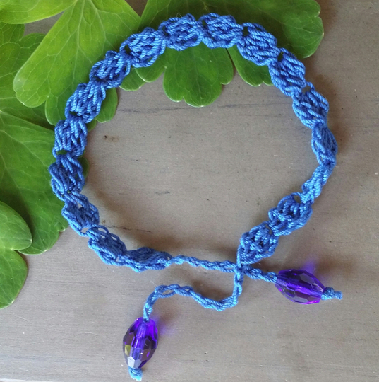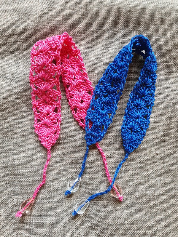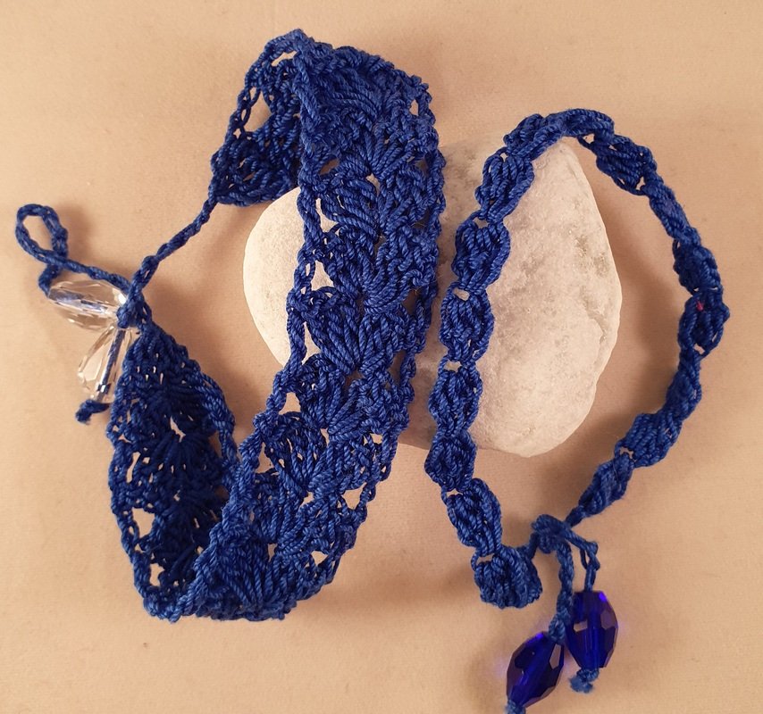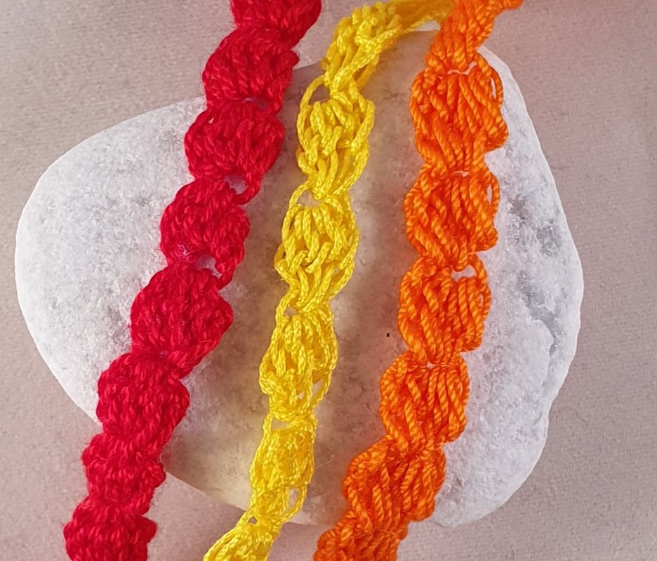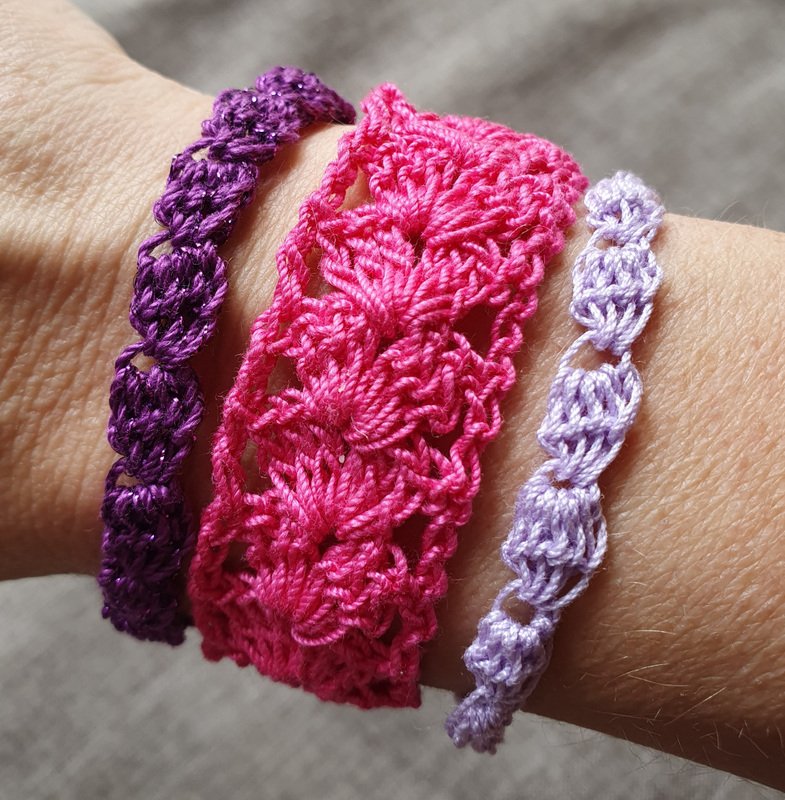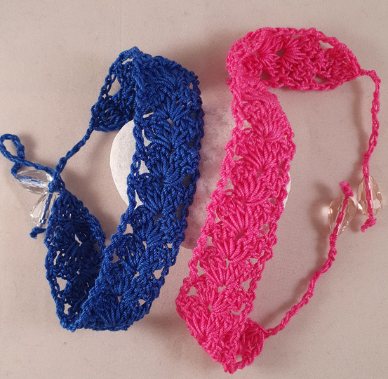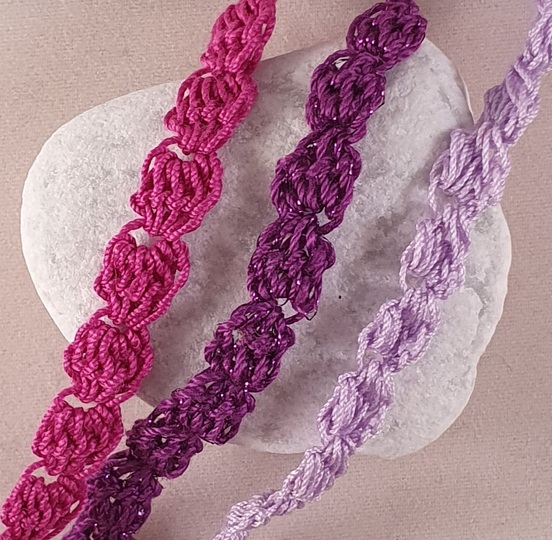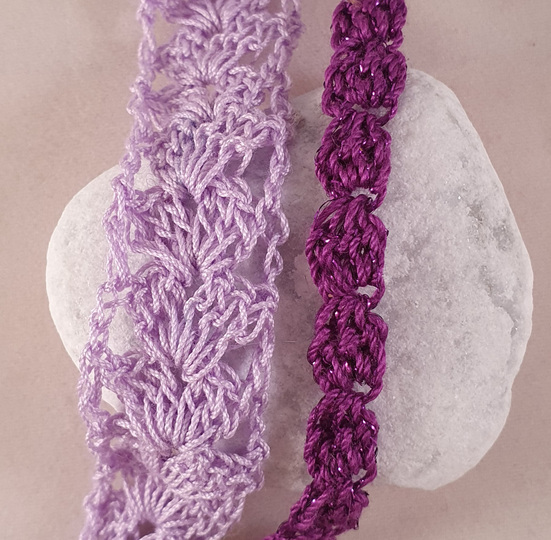 Die Bänder können beliebig lang gearbeitet werden, die Breite ergibt sich aus der Garn- und Nadelstärke (0,5-2 cm)
