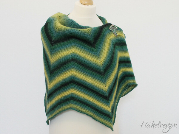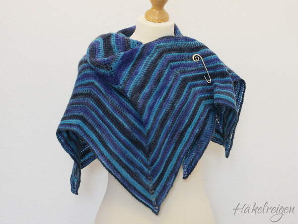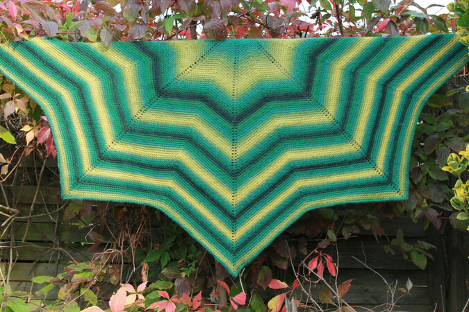 Halbkreis-Variante: ca. 145 x 66 cm (gehäkelt mit 200 gr. Schoppel Zauberball, 420 m / 100 gr.)