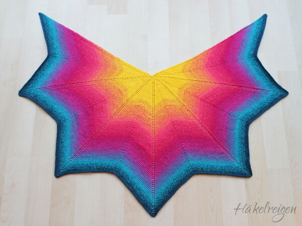 Altaira ist ein sternförmiges, tunesisch gehäkeltes Tuch für Wolle mit einem mittleren oder langen Farbverlauf.