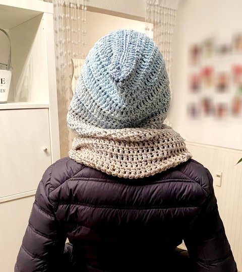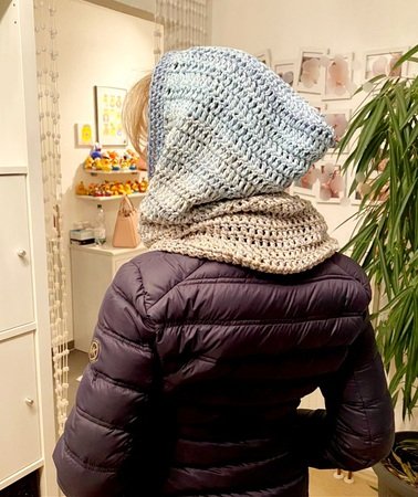 Der Schal ist dann trotzdem noch schön warm um den Hals und man muss die "Mütze" nirgendswo hinstecken.