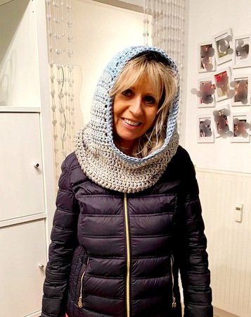 Der Hoodie Schal ist ein Loopschal mit Kapuze, die man ruckzuck auch herunterziehen und hängenlassen kann.