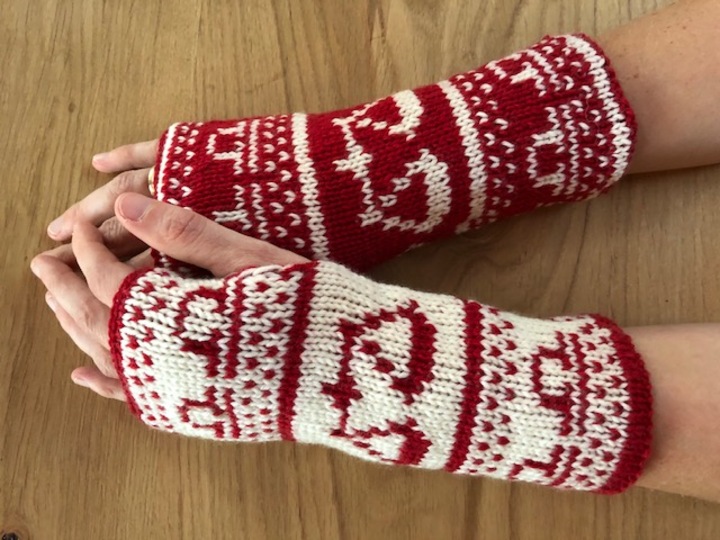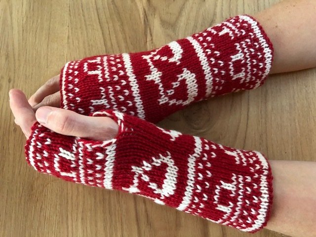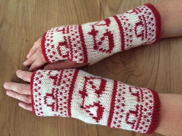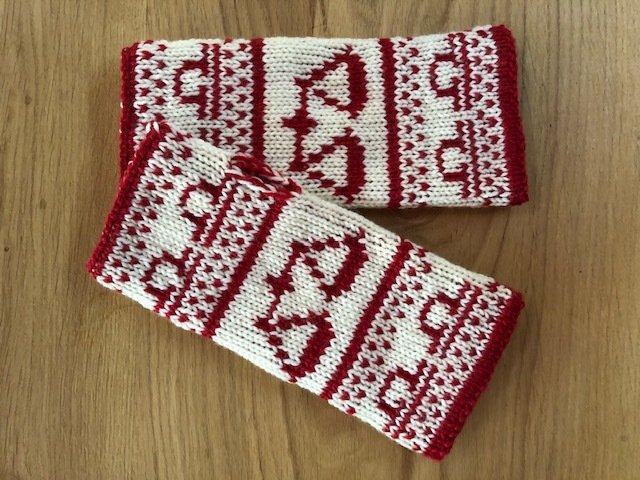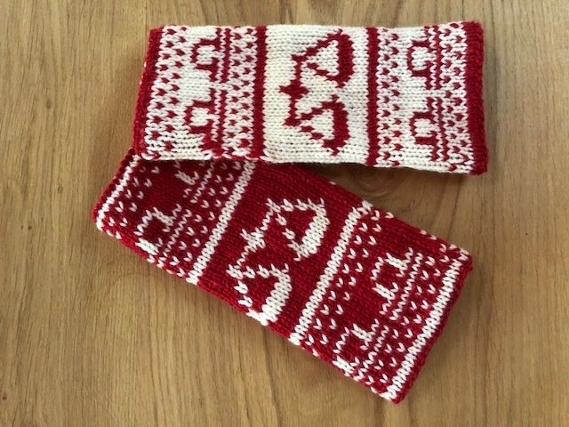 Diese Armstulpen sind in einer Technik namens double face gestrickt. Dies bedeutet, man hat innen keine Fäden gespannt, an denen man beim Anziehen auch noch hängenbleibt (und zu allem Übel vielleicht auch noch Fäden zieht!). Vielmehr kann man sie einfach wenden und hat dann keine rote Waage mehr auf weißem Grund, sondern eine weiße Waage auf rotem Grund.