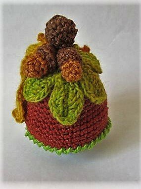 (Ich habe für den Korpus der Eierwärmer Baumwollgarn der LL 125 m / 50 g und für die Blätter Sockengarn der LlL 400m / 100 g verwendet.)