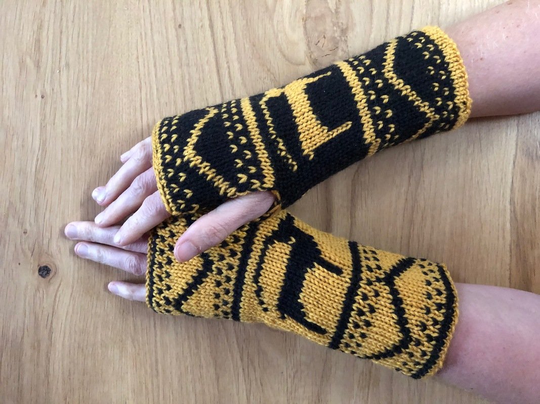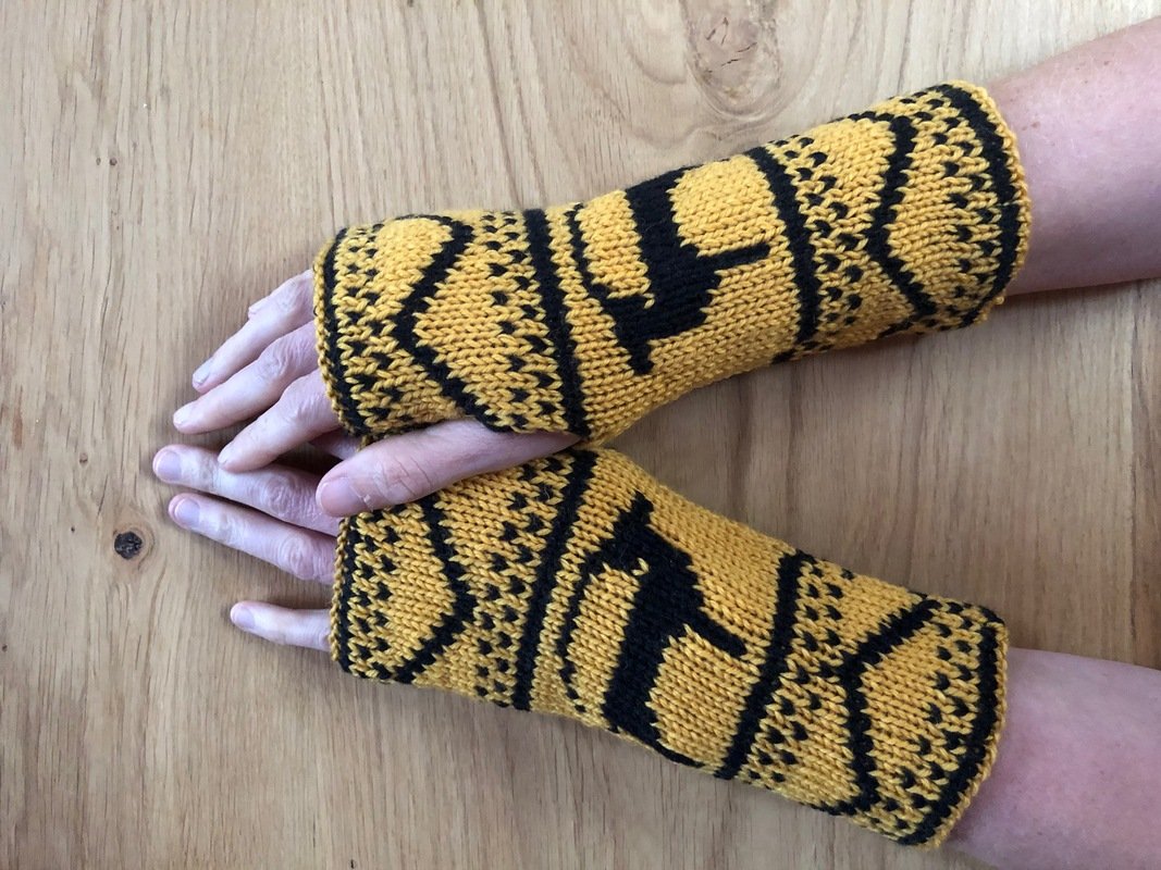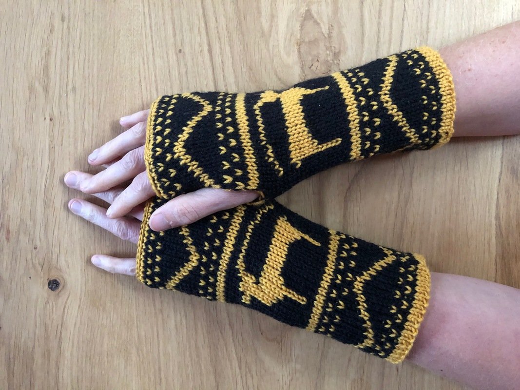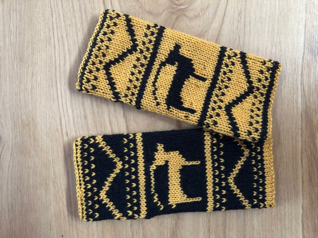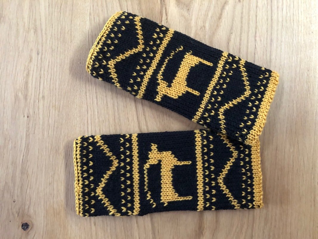 Diese Armstulpen sind in einer Technik namens double face gestrickt. Dies bedeutet, man hat innen keine Fäden gespannt, an denen man beim Anziehen auch noch hängenbleibt (und zu allem Übel vielleicht auch noch Fäden zieht!). Vielmehr kann man sie einfach wenden und hat dann keinen safran farbigen Steinbock mehr auf schwarzem Grund, sondern einen schwarzen Steinbock auf safran farbigem Grund.