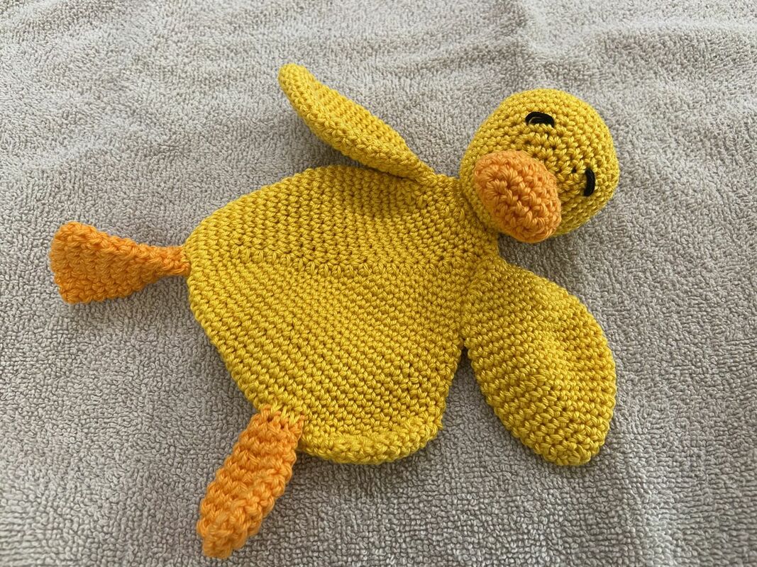 Ein niedliches, knallgelbes Schmusetuch "Ente" heißt den neuen Erdenbürger oder die neue Erdenbürgerin herzlich willkommen.