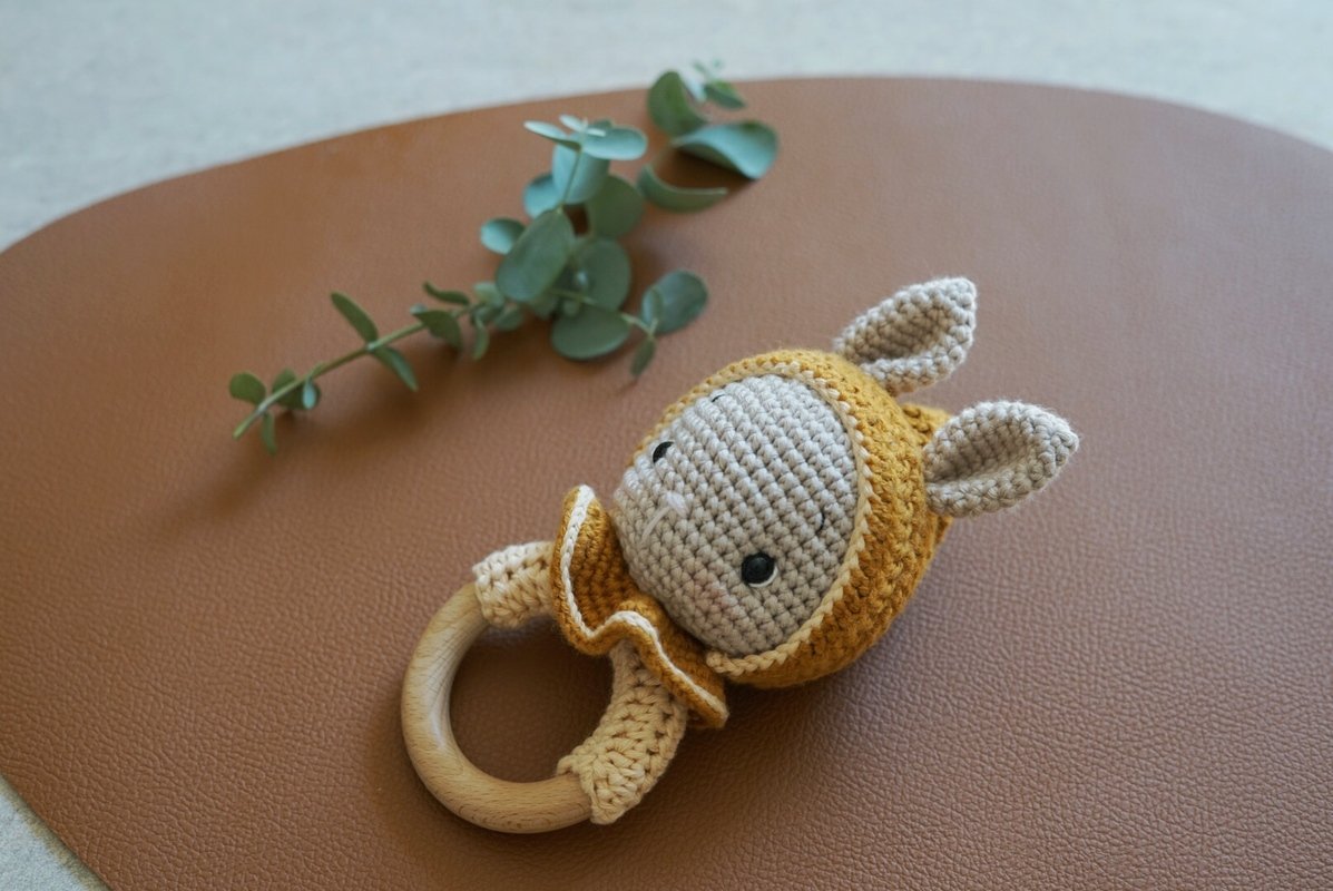 Verwendete Materialien: Baumwolle (maximale Laufmeter von 105m pro 50g) für den Hasen in 2-3 Farben, schwarzes, weißes und rosa Stickgarn, Häkelnadel in 2,5mm, Füllwatte, Sticknadel, Sicherheitsaugen in 8 mm, eine Rassel oder ähnliches zum Einbau in den Kopf, Greifring aus Holz.