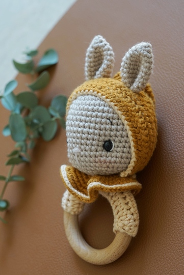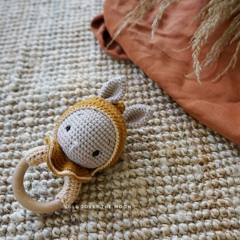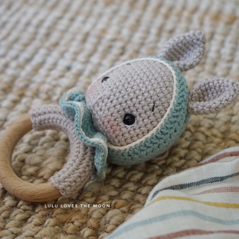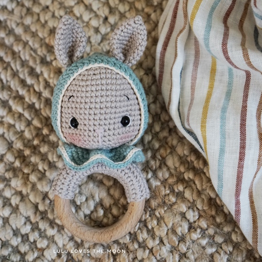 Mit dieser Anleitung kannst du deine eigene Rassel mit dem bunny Peaches Hasenkopf häkeln. Enthalten ist die Anleitung für den Hasenkopf mit Mütze und Kragen.