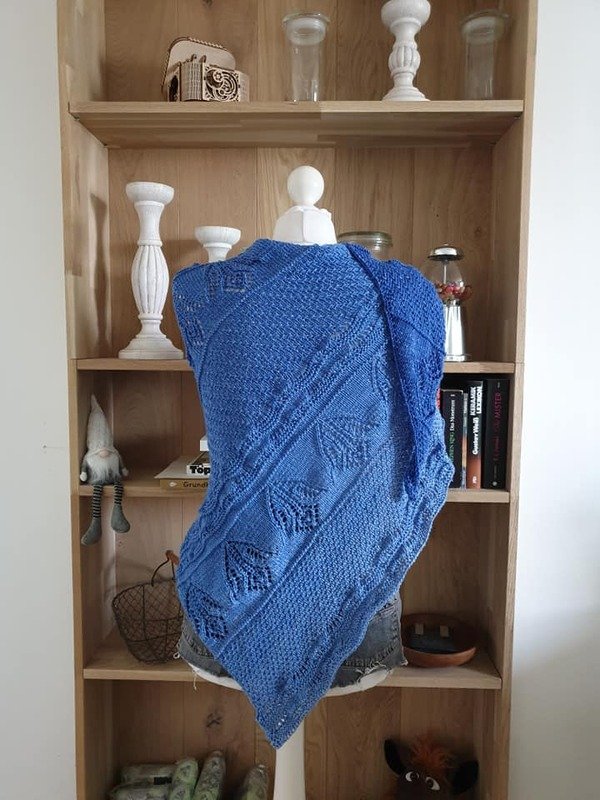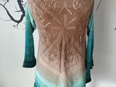 Maschen: rechte, linke, Umschläge, kfb, 2 Maschen zusammen stricken und 3 Maschen zusammen stricken sowie überzogene Umschläge (wird in der Legende erklärt).