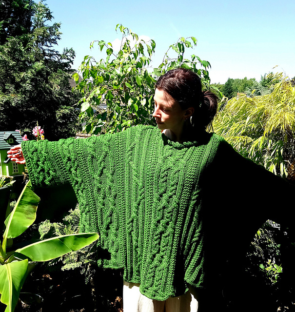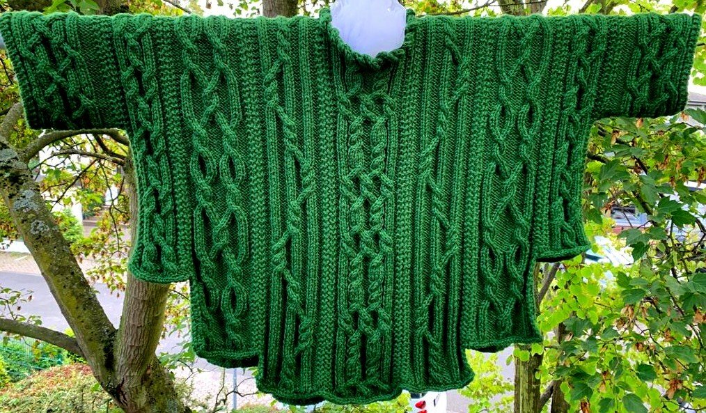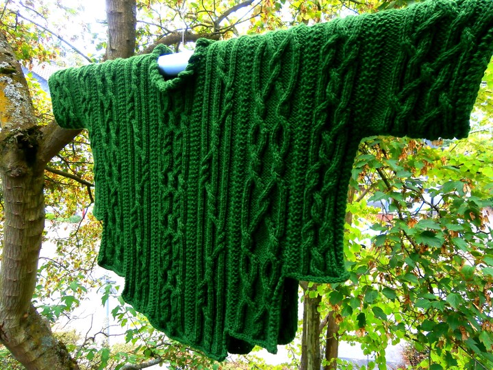 Bedingt durch das üppige Zopfmuster ist der Garnverbrauch recht hoch und der Pulli daher kein Leichtgewicht. Die Idee lässt sich aber ganz einfach auf ein Projekt mit feinerem Garn anwenden.