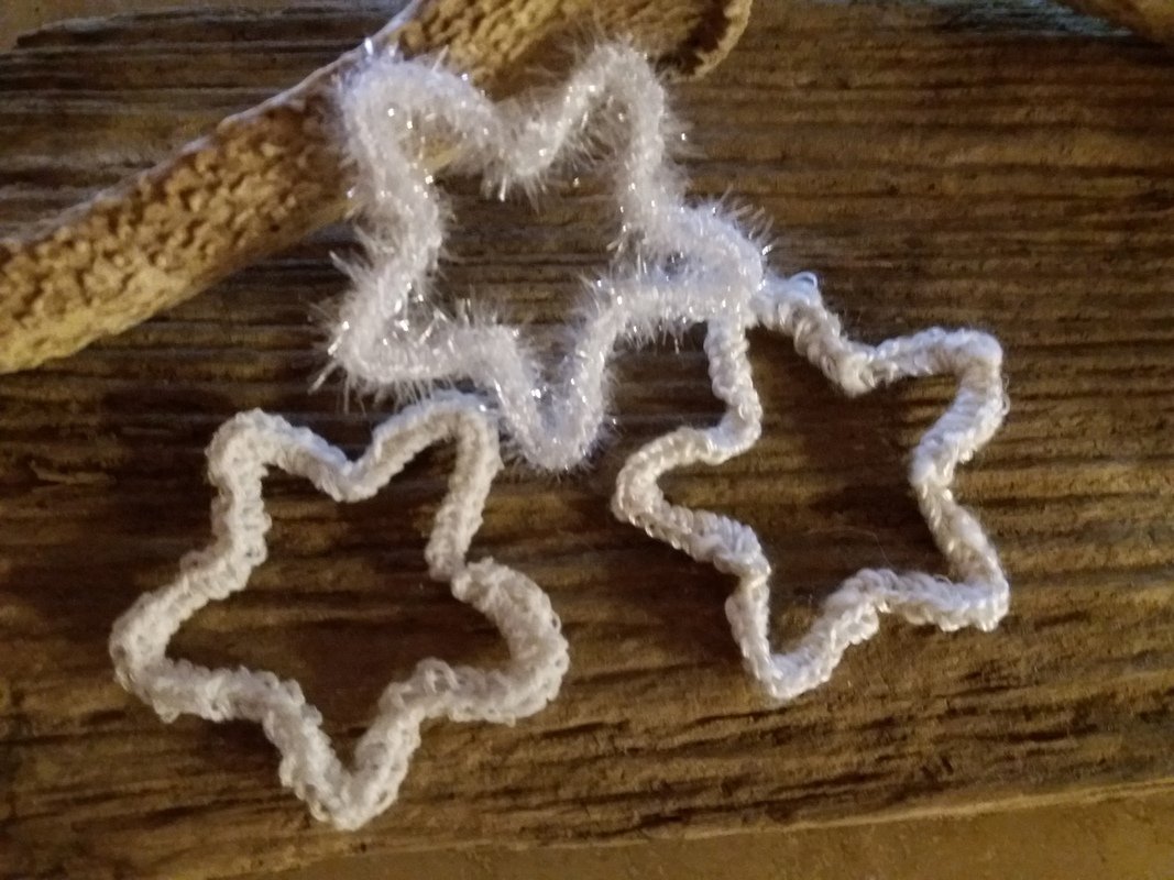 Material : Vorlage fünfzackiger Stern (kann ein Keksausstecher oder eine Papiervorlage sein), Draht (Blumendraht), Brett, Bleistift, Zangen, Hammer, Nägel, Garn (sehr schön wirkt das Schwammgarn und Paketschnur), passende Häkelnadel, Nähnadel.