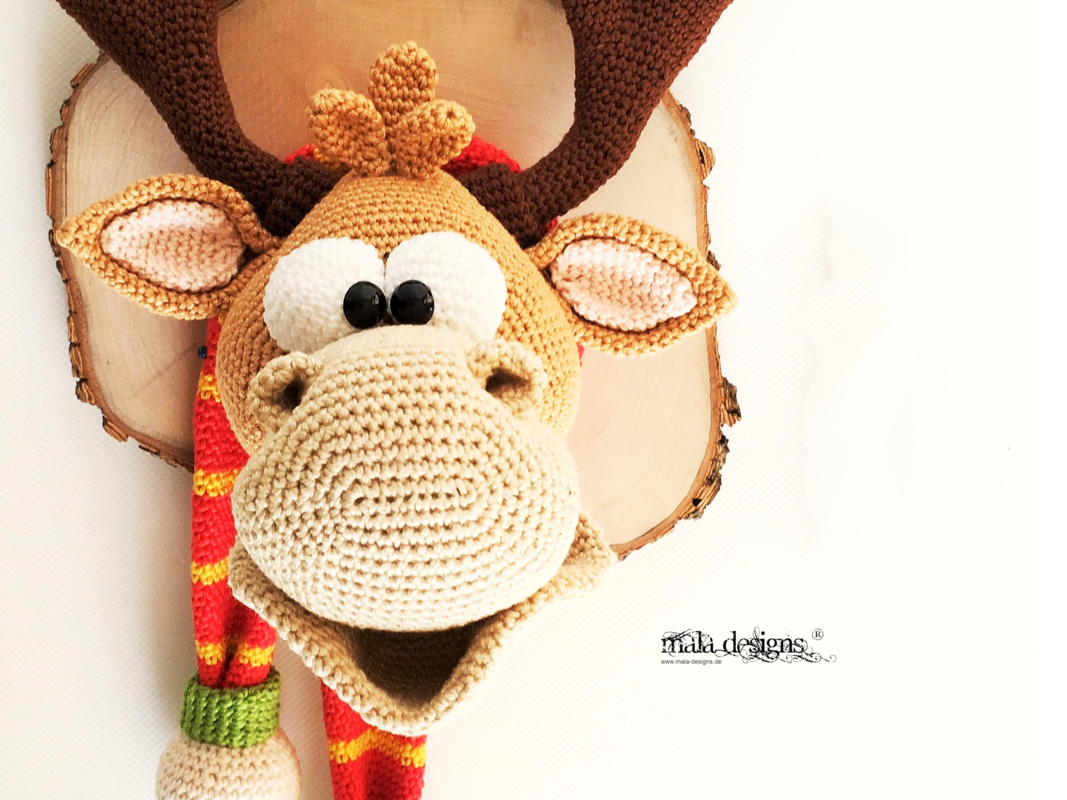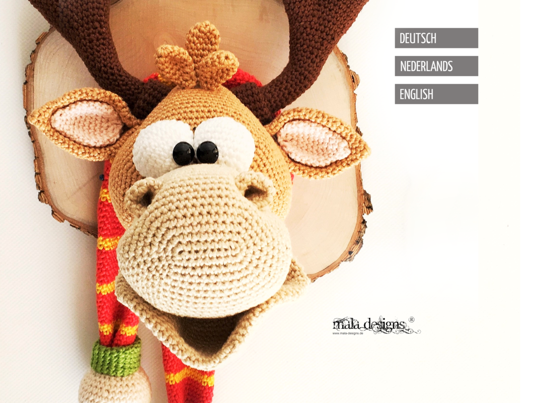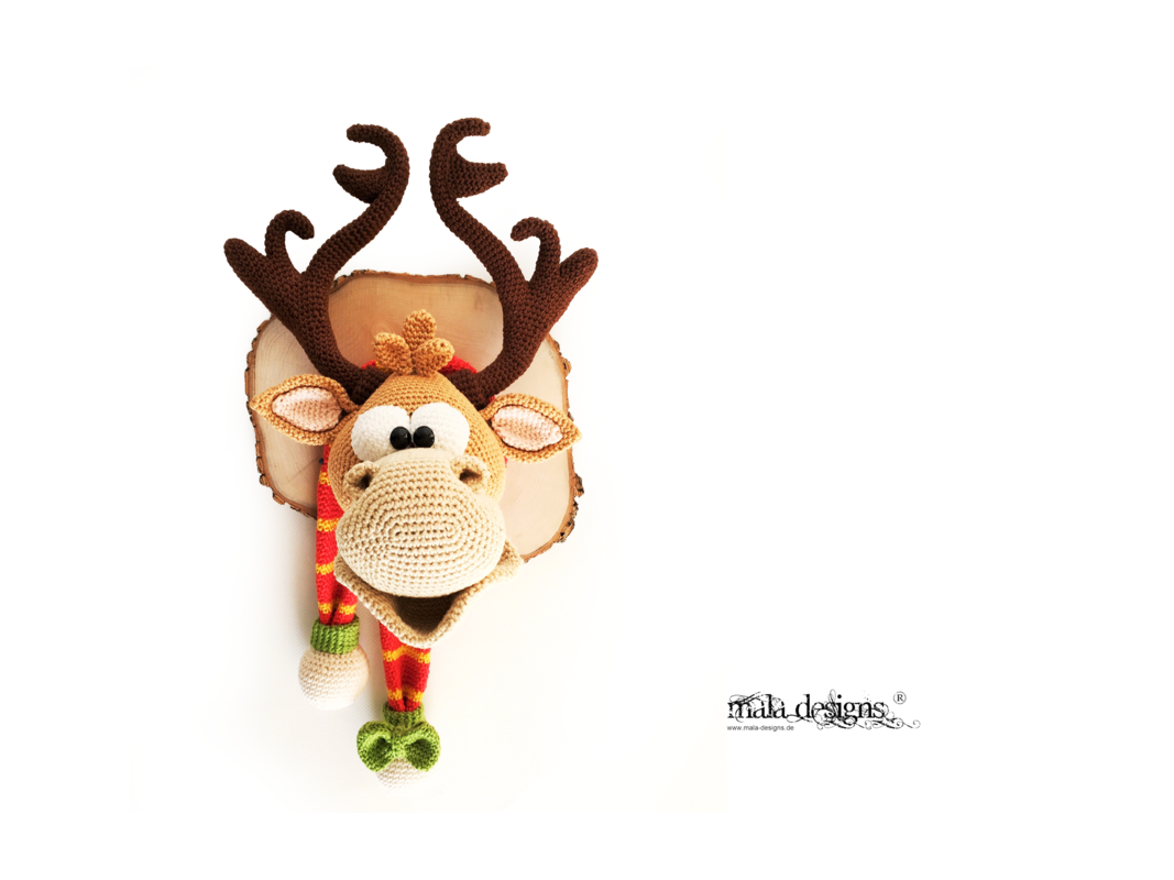 Diese Häkelanleitung beinhaltet: den Hirsch als Trophäe. Der Hirsch nach Fertigstellung ca. 42 cm x 23 cm (L x B) groß. Zusätzlich wird ein Trophäenschild benötigt. Das hier verwendete Holzbrettchen hat eine Maße von ca. 22 cm x 15 cm (BxL)