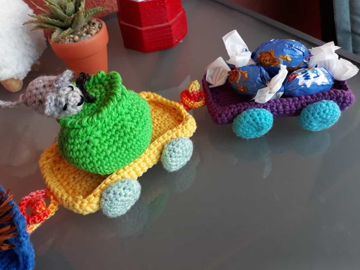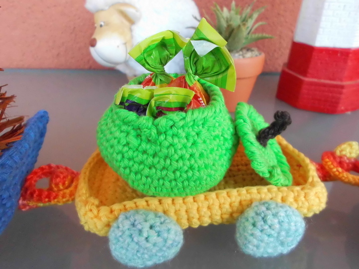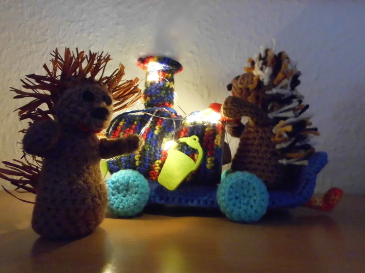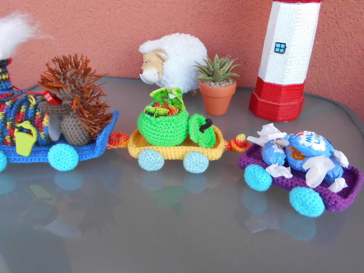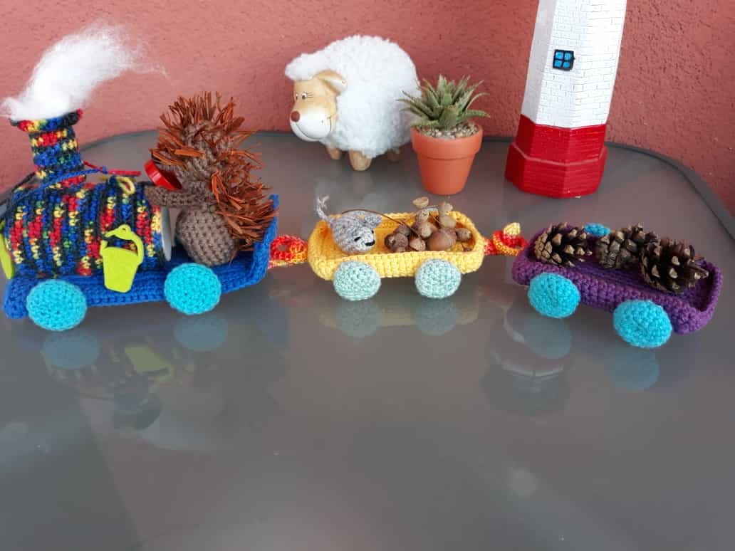 Eine gute Gelegenheit zum Verarbeiten von Wollresten.Ideal als Herbst-Dekoration als Stimmungsaufheller, zum spielen,als Geschenk-Verpackung oder als Süssigkeiten-Express. Der Zug kann beliebig erweitert oder durch eine andere Beladung verändert werden. Der Fantasie sind keine Grenzen gesetzt.