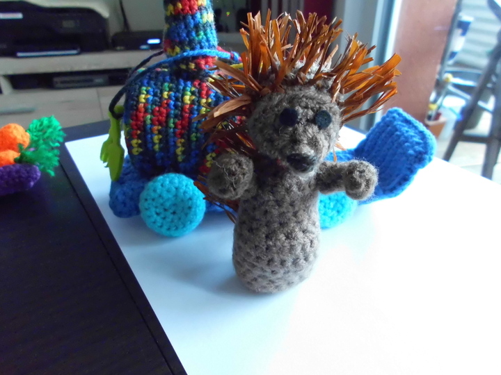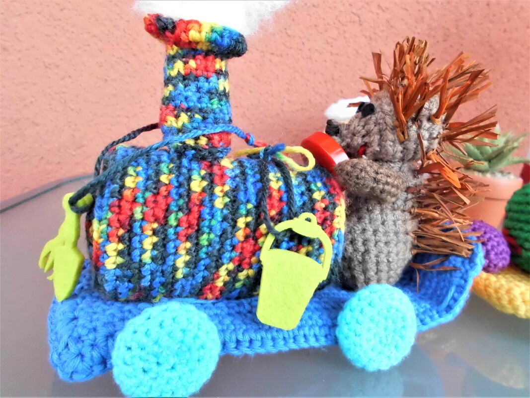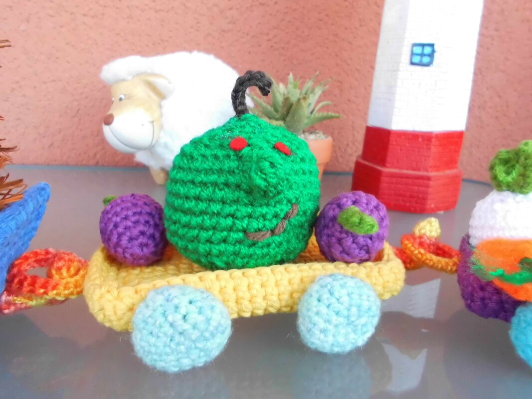 Diese Anleitung beinhaltet das Häkeln von der Lokomotive, dem Igel, zwei Waggons,einer Pflaume,zwei verschiedene Äpfel,Rettich,Möhre und Kartoffel.