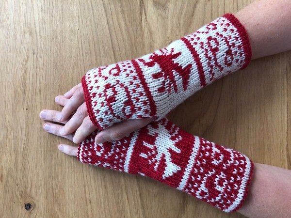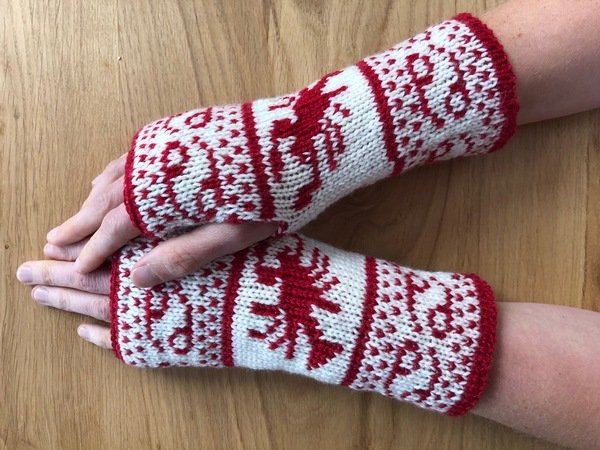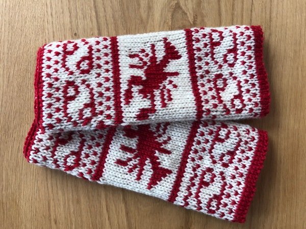 Diese Armstulpen sind in einer Technik namens double face gestrickt. Dies bedeutet, man hat innen keine Fäden gespannt, an denen man beim Anziehen auch noch hängenbleibt (und zu allem Übel vielleicht auch noch Fäden zieht!). Vielmehr kann man sie einfach wenden und hat dann keinen roten Krebs mehr auf weißem Grund, sondern einen weißen Krebs auf rotem Grund.